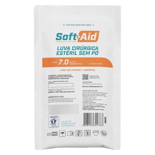 ----------------------------------------- ATENÇÃO: ✔ PRODUTO ORIGINAL ✔ COM NOTA FISCAL ✔ PRONTA ENTREGA ✔ ENVIO RÁPIDO ✔ VENDEDOR COM REGISTRO E AUTORIZAÇÃO ANVISA nº 8.30660-8 COMPRE COM TRANQUILIDADE! ----------------------------------------- Luvas para procedimentos cirúrgicos produzidas em látex de borracha natural, com palma texturizada, estéril, sem pó e anatômica da marca Soft Aid. Tamanhos 7,0 ou 7,5 (Escolha no momento da sua compra) Apresentamos a Luva Cirúrgica de Látex Natural sem pó da marca Soft Aid, que é indicada para procedimentos cirúrgicos. Luva com palma texturizada, anatômica, com virola no punho, de uso único, estéril e de cor natural, a luva proporciona barreira contra contaminação cruzada entre usuários e pacientes, evitando possíveis contaminações durante os procedimentos. Produto certificado, testado em laboratório e aprovada para proteção das mãos do usuário contra riscos biológicos. Cor: Branco Aplicações: Hospitais, Clínicas, Consultórios, Laboratórios, Licitações, Farmácias; Instruções: As luvas de látex natural são descartáveis e de uso único, não devendo ser reutilizadas. Produto estéril e proibido de ser reprocessado; Riscos: Procedimentos com possível exposição a agentes biológicos, com fluidos corpóreos e não invasivos. ANVISA 81229609006 CA 52670 Norma ABNT NBR ISO 10282:2014