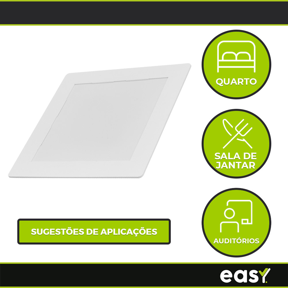 Distribuído por: Ismafer Ferramentas Painel Easy: Ideal para iluminação interna de ambientes residenciais, comerciais ou corporativos. • Propriedades: - Construção livre de mercúrio. - Painel com acabamento em policarbonato na cor branco. - Baixo consumo de energia. • Características de Funcionamento: - Tensão nominal: 100V a 240V (BIVOLT) - Fator de potência: >0,50. - Baixo consumo de energia. - Tipo de Instalação: Embutir. • Características: - Temperatura de Cor: 3000k | Branco Quente. - Não Dimerizável. - Ângulo de Abertura: 120°. - IRC**: 70. - Tipo de Uso: Interno. • Especificações Técnicas: - Potência: 18W. - Tensão: 100V - 240V Bivolt. - Fluxo Luminoso: 840Im. - Eficiência Luminosa: 70 lm/W. - Peso: 121g. - Dimensões: A = 210mm | L = 210mm. • Garantia: A garantia inicia-se na data da compra do produto, desde que sejam respeitadas as condições de uso descritas na embalagem, sendo necessário apresentar o Cupom ou a Nota Fiscal. • Sobre o Produto: Descubra o Painel Easy - Ideal para iluminação interna de ambientes residenciais, comerciais ou corporativos. • Sobre a Marca: Conheça a EASY - uma marca inovadora que une tecnologia de ponta à economia, sem abrir mão da qualidade. Nossos produtos são projetados para simplificar sua vida, oferecendo o máximo em eficiência e economia. Com valores justos, a EASY torna a experiência tecnologia acessível a todos. Experimente a excelência em cada detalhe - escolha EASY. Distribuído por: Ismafer Ferramentas