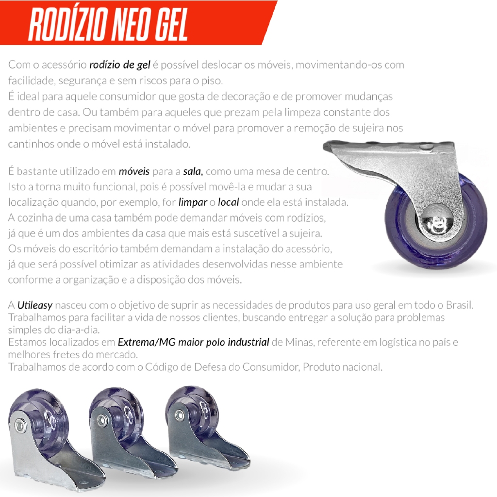 KIT COM 10 UNIDADES Rodízio Neo Gel 40mm é a escolha ideal para quem deseja mover seus móveis com facilidade, segurança e sem danificar o piso. Feito com material de alta qualidade, possui um corpo em aço galvanizado tratado com zinco, garantindo durabilidade e resistência contra a corrosão. Com nosso rodízio semi siliconado, você pode esquecer os riscos no piso e aquele barulho irritante ao mover móveis ou cadeiras. Características do Produto: Material do Corpo: Aço galvanizado tratado com zinco para máxima durabilidade. Fixação do Rodízio: Chapa com 3 furo Altura do Rodízio: 40mm Comprimento Total: 45mm Comprimento Metal: 35mm Diâmetro da Roda: 30mm Diâmetro dos Furos: 5mm (menor) e 7mm (maior) Capacidade de Carga: Suporta até 50 kg por rodízio. Para garantir maior segurança e durabilidade, recomendamos utilizar até 75% da capacidade máxima. Rodízio Giratório: Não (modelo fixo para maior estabilidade). Por que Escolher o Rodízio Neo Gel? Protege o Piso: Rodinha semi siliconada que evita arranhões, ideal para pisos de madeira, cerâmica, laminados e outros. Movimentação Silenciosa: Evita aquele barulhinho incômodo ao arrastar os móveis. Fácil Instalação e Ótimo Custo-Benefício: Instale rapidamente e aproveite a qualidade e durabilidade sem gastar muito. Aplicações Versáteis: Perfeito para uso em móveis de sala, como mesas de centro, cadeiras de escritório, móveis de cozinha, entre outros. Facilita a limpeza e a organização do ambiente ao permitir que os móveis sejam movidos sem esforço. Invista na Qualidade e Segurança dos Seus Móveis! Não perca mais tempo com rodízios que marcam o piso ou fazem barulho. Escolha o Rodízio Neo Gel 40mm e tenha a tranquilidade de saber que seus móveis estarão sempre protegidos e fáceis de mover! Outros Kits deste produto: KIT 20 UN RODIZIO NEO GEL 30mm KIT 50 UN RODIZIO NEO GEL 30mm KIT 15 UN RODIZIO NEO GEL 30mm KIT 8 UN RODIZIO NEO GEL 30mm KIT 6 UN RODIZIO NEO GEL 30mm KIT 4 UN RODIZIO NEO GEL 30mm KIT 2 UN RODIZIO NEO GEL 30mm Confira a nossa ampla variedade de rodízios, cada um projetado para diferentes aplicações e necessidades. Sempre que precisar de rodízios para seus móveis, visite a loja da Utileasy e encontre a solução perfeita para você! *Se você precisar de uma quantidade diferente do anuncio, nos informe via campo de perguntas a quantidade exata que deseja, que nós fazemos um anuncio exclusivo para você. *Veja nossas qualificações *Conheça nossos produtos (Temos outros modelos de Rodizio, conheça já) *Tire suas dúvidas no campo de perguntas *Enviamos para todo o Brasil! NOSSA EMPRESA A Utileasy nasceu com o objetivo de suprir as necessidades de produtos para uso geral em todo o Brasil. Trabalhamos para facilitar a vida de nossos clientes, buscando entregar a solução para problemas simples do dia-a-dia. Produto nacional Estamos localizados em Extrema/MG maior polo industrial de Minas, referente em logística no país e melhores fretes do mercado; Trabalhamos de acordo com o Código de Defesa do Consumidor; POLÍTICA DE TROCA Recebendo a Mercadoria Verifique a mercadoria assim que recebê-la, antes de assinar. Em caso de avaria, produto incorreto ou outros problemas, o destinatário tem o direito de recusar a mercadoria sem custo. *Já recebeu e viu algum defeito? Todos os produtos tem garantia contra defeitos de fabricação. Então fique tranquilo caso tenha algum produto com defeito, iremos fazer a troca assim que recebermos a solicitação. SERVIÇO DE ATENDIMENTO AO CLIENTE Postagem: As mercadorias serão postadas para pedidos até as 14 horas Satisfação Garantida Melhor Custo Benefício Conte com uma equipe especializada para atender a todas as suas dúvidas 24 horas/dia, 7 dias/semana. Garantia do vendedor: 1 mês