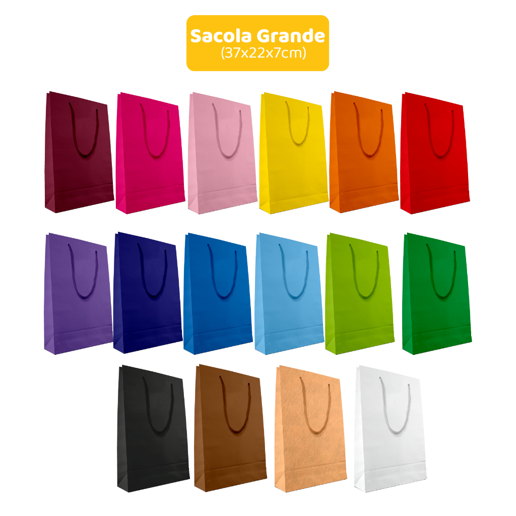 Kit c/ 10 Sacolas de Papel Tamanho Grande - 37x22x7cm | Várias cores