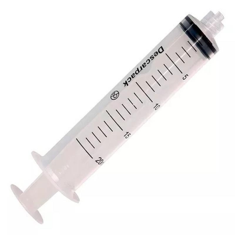 SERINGAS 20ML SEM AGULHA DESTINADA A INFUSÃO E COLETA DE LÍQUIDOS EM PROCEDIMENTOS MÉDICOSHOPITALARES COMPOSIÇÃO CILINDRO E EMBOLO EM PVC GRAU CIRÚRGICO E PONTA DO EMBOLO EM BORRACHA EMBOLO RETO QUE NÃO SE DESPRENDE DEVIDO O ANEL DE RETENÇÃO BICO LUER LOCK BICO ROSCA ESTÉRIL USO ÚNICO ATÓXICA EMBALADO INDIVIDUALMENTE EM PAPEL GRAU CIRÚRGICO