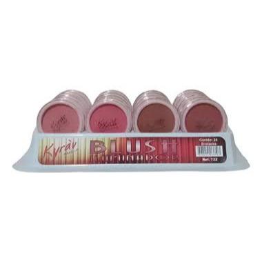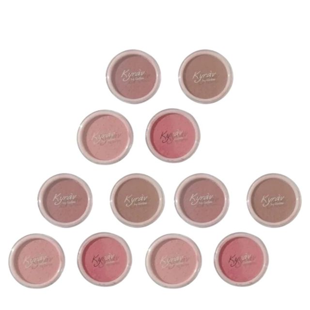 Kit Blush Iluminador Facial Kyràv O Kit Vai com 12 unidades. São 4 tons, as cores se repetem no kit Blush Compacto Kyrav, para arrasar no seu make do dia a dia. Dimensões do produto unitário: 4,8cm de diâmetro X 1,1m de altura cada Peso Liquido: 3g cada
