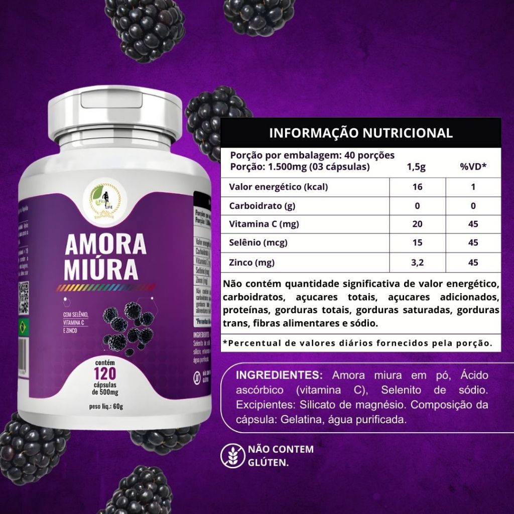 —————————————— • BEM VINDOS A LOJA! • —————————————— A Mega Store é uma empresa consolidada no mercado de suplementos alimentares, cordas sisais e produtos naturais em geral, atuando há mais de 6 anos. Com um amplo mix de produtos, a Mega Store oferece uma variedade de opções para atender às necessidades e preferências dos seus clientes. Com um compromisso com a qualidade, a Mega Store trabalha com fornecedores de confiança e produtos de alta qualidade, garantindo a satisfação dos seus clientes. Além disso, a empresa se destaca pelo atendimento personalizado e pela busca constante por inovação e novidades do mercado. Com uma equipe dedicada e experiente, a Mega Store está sempre pronta para auxiliar seus clientes e proporcionar uma experiência de compra diferenciada. Venha conhecer a Mega Store e surpreenda-se com a variedade e qualidade dos seus produtos. Nossa missão na Mega Store é oferecer produtos de alta qualidade para a saúde e bem-estar de nossos clientes. Estamos comprometidos em fornecer suplementos alimentares, cordas sisais e produtos naturais que atendam às necessidades e expectativas de nossos consumidores. Além disso, buscamos sempre manter a excelência no atendimento ao cliente, oferecendo um ambiente acolhedor e informativo para auxiliar nossos clientes a alcançarem seus objetivos de saúde e qualidade de vida. Acreditamos no poder dos produtos naturais e estamos empenhados em promover um estilo de vida saudável e equilibrado para todos que passam pela nossa loja. ----------------------------------------------------------------------------------------------------- O suplemento alimentar Amora Miura da marca Fits Life é uma formulação que combina ingredientes poderosos, como Selênio, Vitamina C e Zinco, visando promover a saúde e o bem-estar. A Amora Miura é conhecida por suas propriedades antioxidantes, além de ser rica em vitamina C, que é fundamental para o fortalecimento do sistema imunológico e para a saúde da pele. ### Composição e Benefícios: - **Amora Miura**: Esta fruta é rica em antioxidantes, que ajudam a combater os radicais livres no organismo, contribuindo para a saúde celular. - **Selênio**: Um mineral essencial que desempenha um papel importante na função imunológica e na proteção das células contra danos oxidativos. pode ajudar a melhorar a saúde do cabelo e da pele. - **Vitamina C**: Conhecida por suas propriedades antioxidantes, a Vitamina C é crucial para a síntese de colágeno, essencial para a saúde da pele e tecidos. Ela também contribui para a absorção do ferro e fortalece o sistema imunológico, ajudando a proteger o organismo contra infecções. - **Zinco**: Um mineral vital para diversas funções biológicas, o zinco é importante para o sistema imunológico, a cicatrização de feridas e a síntese de proteínas. Também está envolvido na metabolização de carboidratos e no funcionamento adequado das enzimas do organismo. ### Qualidade e Materia Prima Importada: A Fits Life se destaca no mercado de suplementos pela sua dedicação à qualidade. A marca utiliza matéria-prima importada, garantindo que seus produtos atendam a padrões elevados de pureza e eficácia. O processo de produção é rigoroso, assegurando que os consumidores recebam um suplemento que não somente complemente suas dietas, mas que também promova a saúde de maneira segura e eficaz. ### Indicação: O suplemento Amora Miura é indicado para pessoas que buscam aumentar a ingestão de antioxidantes, reforçar o sistema imunológico e garantir a ingestão adequada de nutrientes essenciais. É especialmente recomendado para aqueles que têm uma vida ativa, buscam suporte para a saúde geral ou desejam melhorar a saúde da pele e do cabelo. Antes de iniciar qualquer suplementação, é sempre aconselhável consultar um profissional de saúde para garantir a adequação do produto às suas necessidades individuais. Com a combinação eficaz de Amora Miura, Selênio, Vitamina C e Zinco, a Fits Life oferece um suplemento de qualidade que pode ser um grande aliado em sua rotina de saúde. RECOMENDAÇÃO Idade recomendada: Acima de 19 anos. Sugestão de uso: 03 Cápsulas ao dia / Ingerir com líquidos. Quantidade: 120 Cápsulas. Não contém glúten. Matéria prima importada. Aviso Legal da Anvisa: 1- Não ultrapassar a dose diária recomendada do suplemento. 2- Manter os suplementos fora do alcance de crianças. 3- Esse produto não deve ser consumido por gestantes, lactantes e crianças. Imagens Meramente Ilustrativas/Exemplificativas Produto autorizado para comercialização conforme anexo I da RDC 27/2010 RDC 23/2000 da Anvisa, aut. MS. 6.02234-1
