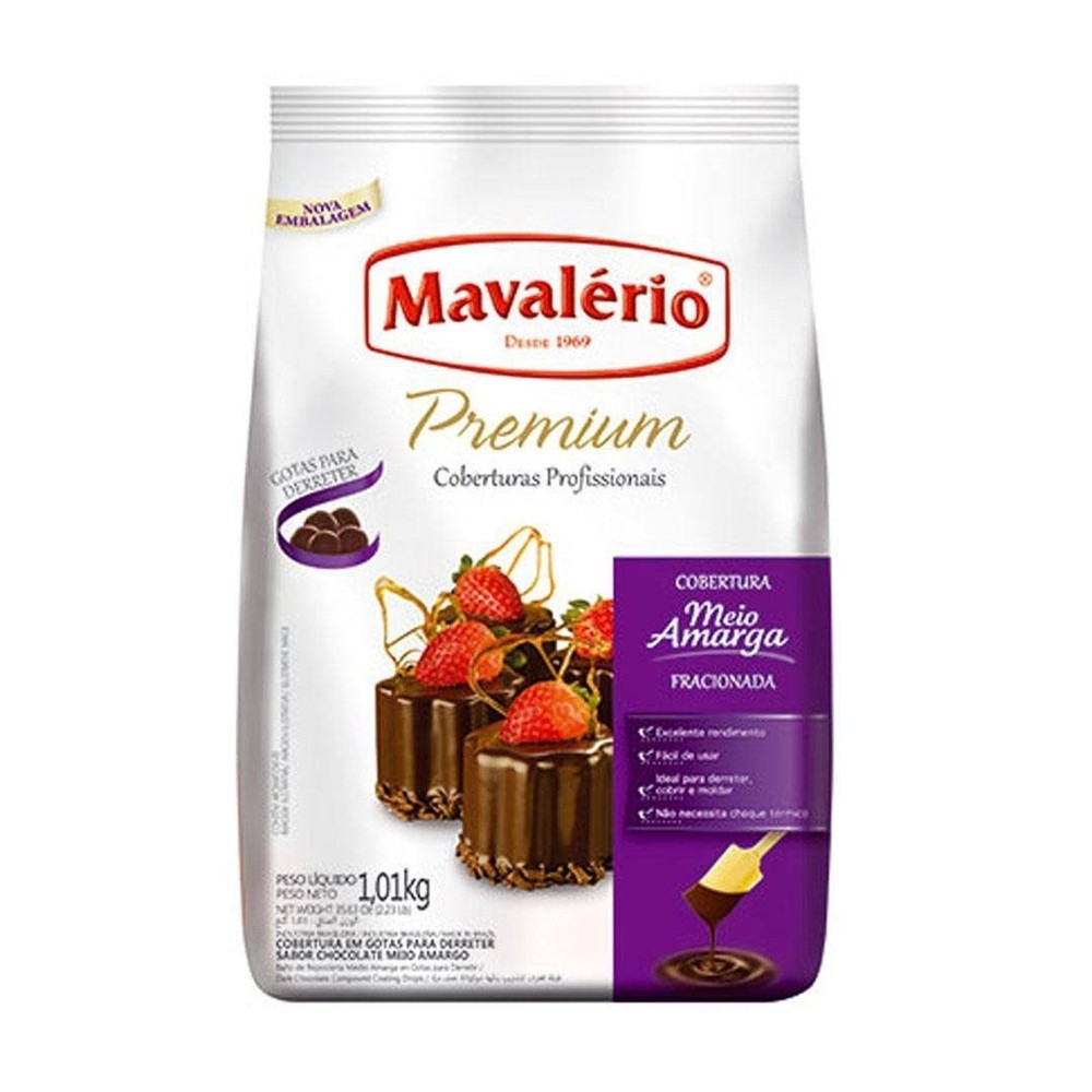 KIT C/2 COBERTURA PREMIUM MAVALERIO GOTAS 1,010KG MEIO AMARGO USO: Para cobrir, moldar e rechear Ovos de Páscoa, tortas, pães de mel, doces, bombons, alfajores e também para acabamentos e decorações, laços, placas e tiras e outros. NÃO CONTÉM GLÚTEN. ALÉRGICOS: CONTÉM DERIVADOS DE LEITE E SOJA. CONTÉM LACTOSE.