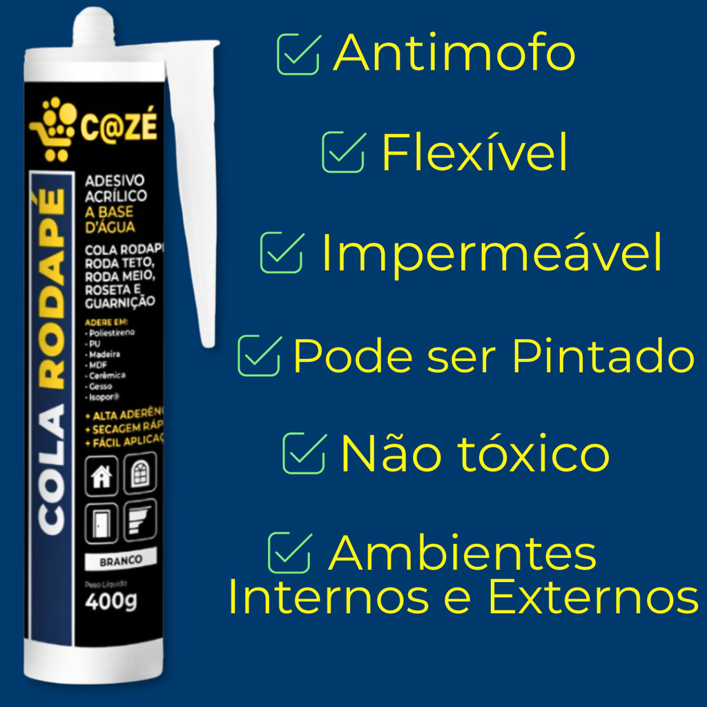 Cola para Rodapé C@ze 400g Alta Aderência, Flexibilidade e Rendimento Superior para Rodapés e Guarnições A Cola para Rodapé C@ze foi desenvolvida com tecnologia à base de água, combinando adesão extraforte, alto rendimento e segurança na aplicação. Ideal para fixação de rodapés de MDF, poliestireno, PU, madeira, cerâmica, isopor, gesso e roda-tetos, sua fórmula ecológica é livre de solventes e não emite odores tóxicos, sendo perfeita para ambientes internos e externos. Principais Benefícios • Extra forte e alta aderência • Aplicação limpa e sem sujeira • Não cola a pele • Fácil remoção de excessos • Pode ser pintado após secagem • Impermeável, antimofo e flexível • Não trinca com o tempo • Aceita pintura com tintas à base de água • Totalmente ecológico e sem cheiro • Alta resistência a sol, chuva e variações de temperatura • Pronta para uso – sem necessidade de mistura Compatibilidade com Diversos Materiais Ideal para: • Rodapés • Roda-meios • Roda-tetos • Guarnições • Rosetas Adere facilmente em: • Poliestireno • Poliuretano (PU) • Madeira e MDF • Cerâmica • Gesso • Isopor Instruções de Uso 1. Limpe bem a superfície para garantir adesão total. 2. Aplique a cola no verso da peça. 3. Una as superfícies e pressione. 4. Para melhor secagem, separe as peças por 15 minutos antes da colagem final. 5. Remova excessos com pano úmido ou espátula. 6. Evite umidade nas primeiras 24 horas. Características Técnicas • Cor: Bege • Aspecto: Pasta cremosa • Tempo de formação de película: ~40 minutos • Cura parcial: 24 horas • Cura total: Até 72 horas • Temperatura de trabalho: -10°C a +120°C • Alongamento à ruptura: 100% • Dureza Shore A: 20 a 30 • Rendimento: até 3,5 m com 2 cordões de 6mm por cartucho • Resistência mecânica e à tração: Excelente • Flexibilidade permanente: Sim • Impermeável e antimofo: Sim • Validade: Indeterminada (com armazenamento adequado) Perguntas Frequentes (FAQ) Essa cola serve para rodapé de MDF? Sim. É uma das aplicações principais do produto, garantindo excelente aderência em MDF e madeira. Funciona em ambientes externos? Sim. Após a cura total, resiste a intempéries, sol e chuva. É necessário esperar para unir as peças? Não obrigatoriamente. Você pode colar imediatamente ou utilizar o método de espera de 15 minutos para acelerar a secagem. A cola tem cheiro forte? Não. Sua fórmula é à base de água, sem solventes, sem cheiro e não tóxica. Pode ser pintada depois? Sim. Aceita pintura com tintas base água após a cura completa. Precisa de ferramentas especiais? Não. Basta uma pistola aplicadora padrão e, se necessário, espátula ou pano úmido para limpeza.