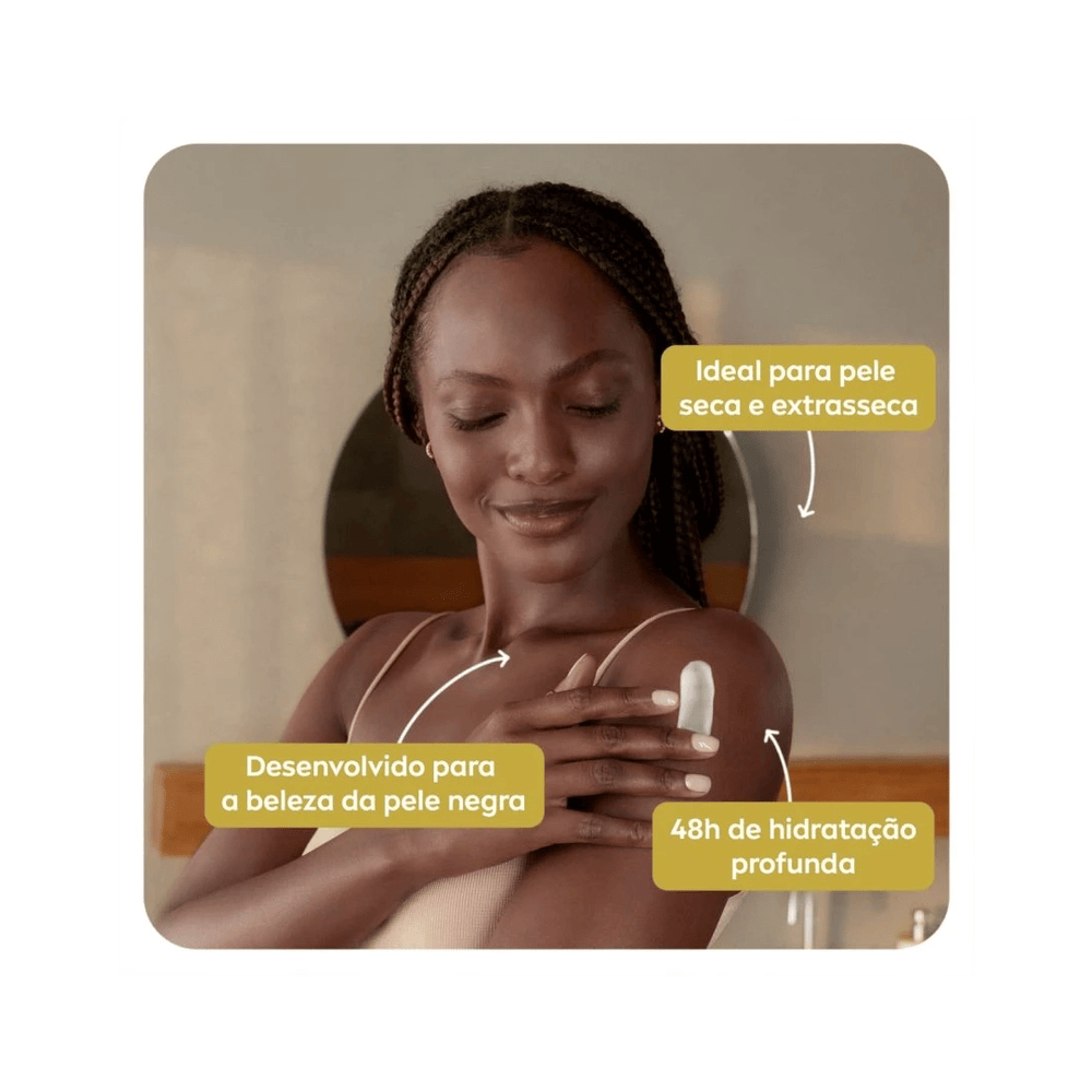 Hidratante corporal desenvolvido especialmente para a beleza da pele negra. Ajuda na reparação das áreas ressecadas e deixa a pele com um brilho natural e saudável. Para pele secas a extrassecas. Para que serve o Loção Deo-Hidratante Beleza Radiante Cuidado Intenso? Formulado com 5 óleos naturais e vitaminas, promove 48h de hidratação profunda além de ajudar na redução de estrias em 2 semanas*. *Teste de percepção. Resultados dependem do uso contínuo do produto. Benefícios e diferenciais 48h hidratação profunda Ajuda na redução de estrias em 2 semanas* Alivia a descamação da pele causada pelo ressecamento Fórmula enriquecida com 5 óleos naturais (Abacate, Oliva, Soja, Macadâmia e Amêndoas) & Vitaminas E, B3 e Pro Vit B5 *Teste de percepção. Resultados dependem do uso contínuo do produto. Como usar o Loção Deo-Hidratante Beleza Radiante Cuidado Intenso? Aplique o produto no corpo duas vezes ao dia, massageando a pele suavemente. Use o produto diariamente para garantir melhores resultados. Uma unidade contém 200ml