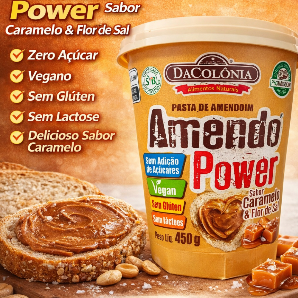 Pasta de Amendoim AmendoPower Caramelo e Flor de Sal 450g – DaColônia Uma explosão de sabor com equilíbrio perfeito entre o doce do caramelo e o toque refinado da flor de sal. A AmendoPower Caramelo e Flor de Sal é uma pasta ultra cremosa, feita com 100% amendoim torrado, adoçada naturalmente com xilitol e sem qualquer ingrediente de origem animal. Diferenciais que fazem a diferença: ✅ Vegana ✅ Sem adição de açúcares ✅ Sem glúten ✅ Sem lácteos ✅ 100% natural ✅ Adoçada com xilitol (adoçante natural) Benefícios do amendoim: Rico em gorduras boas (ômega 9 e ômega 6), fibras, proteínas, vitaminas, minerais e fitosteróis, contribuindo para uma alimentação equilibrada e energética.