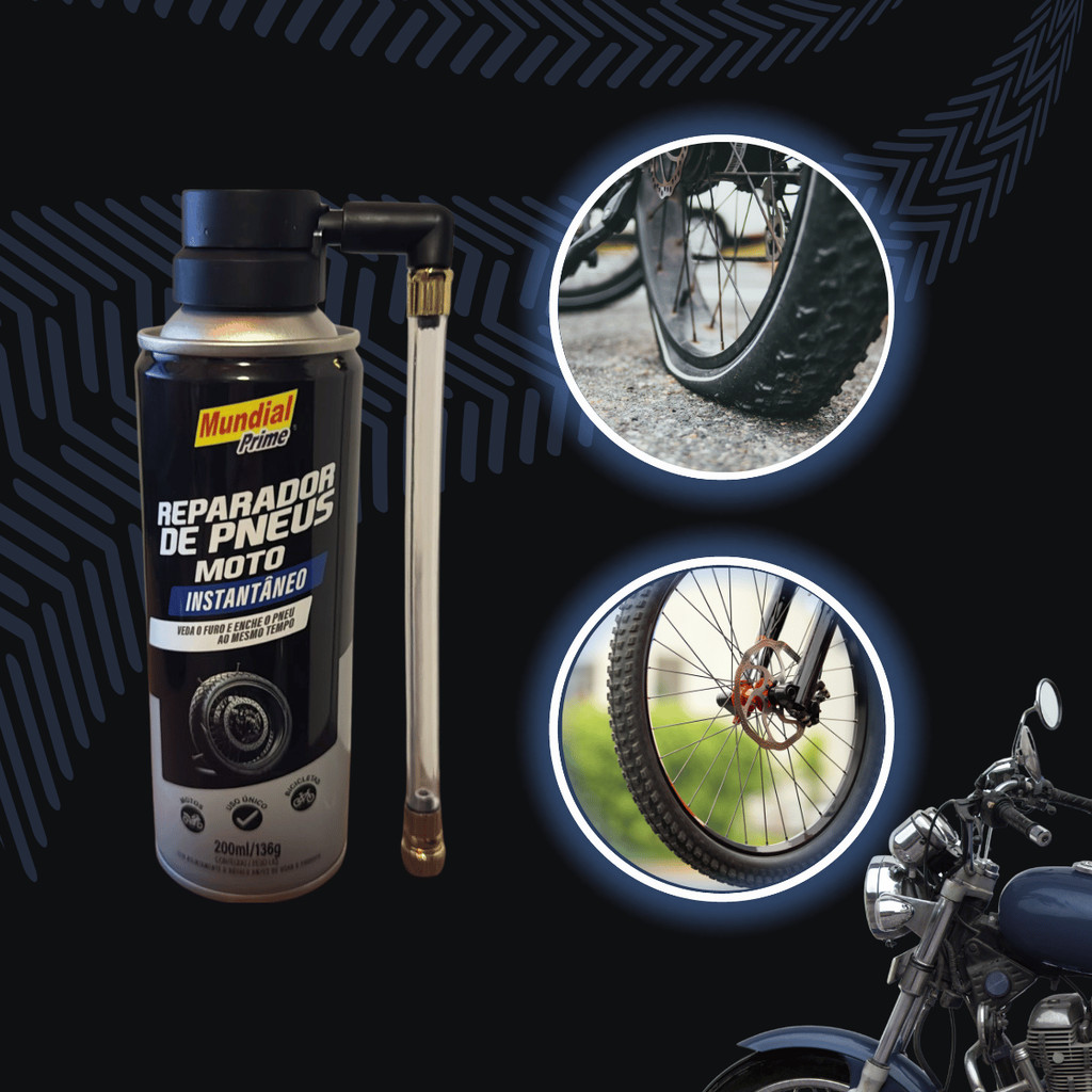 Desenvolvido para reparos rápidos e seguros, o Reparador Mundial Prime é ideal para motociclistas que precisam de praticidade e confiança na estrada. É a solução prática e rápida para emergências com pneus furados em motos. Com 200ml, ele foi desenvolvido para vedar furos pequenos e furos causados por objetos como pregos, parafusos e vidros, proporcionando um reparo temporário eficaz para que você possa seguir viagem com segurança. Atua como solução emergencial até que o pneu seja consertado de forma definitiva, Ideal para emergências e manutenção rápida, Reparação rápida e sem complicação, sem a necessidade de ferramentas. Compre agora e tenha a segurança de um reparo rápido sempre à mão!