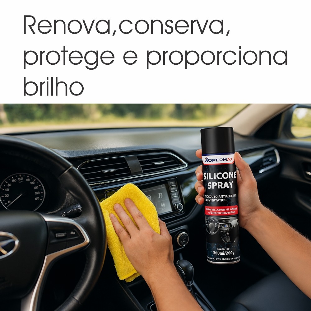Limpa, protege e conserva a superfície tratada, Evita a aderência de colas, graxas e tintas, Não afeta superfícies pintadas, Lubrifica e conserva ferramentas e equipamentos, Protege superfícies metálicas contra umidade, Suave aroma Lavanda. Limpeza e proteção de superfícies de plásticos, vinil, couros, borrachas e lubrificação das canaletas dos vidros e partes móveis do veículo. O Silicone spray Kopermax, proporciona brilho seco em seu veículo. Age diretamente contra o ressecamento de peças plásticas e borrachas. Anula aderência e contaminação das superfícies, deixando-as livres de atrito e reduzindo o desgaste. Em superfícies metálicas, age contra oxidação, corrosão e ferrugem, promovendo maior durabilidade com acabamento limpo, seco sem deixar resíduos. Agite antes de usar. Elimine a sujeira da superfície, aplique o SILICONE NEUTRO KOPERMAX em pequenas quantidades a uma distância entre 15 cm a 20 cm, caso queira, espalhe com uma flanela limpa e seca com movimentos circulares para obter uma película uniforme. Suave aroma Lavanda