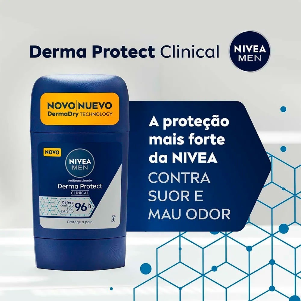 KIT C/3 DESODORANTE NIVEA CLINICAL STICK DERMA PROTECT MASCULINO 54G NIVEA MEN Antitranspirante Roll-on Stick Derma Protect Clinical entrega 96 horas de proteção à pele contra suor e mau odor, possibilitando liberdade para viver ao máximo sem medo de transpirar. Além disso, o cuidado está presente para manter a hidratação, maciez e beleza da pele. Aproveite uma eficácia elevada sem agredir ou manchar a sua axila. Benefícios e diferenciais - 96 horas de extrema proteção contra suor - Fácil de aplicar - Pele protegida - Tecnologia DermaDry - Dermatologicamente testado - Cientificamente comprovado - Toque seco - Axilas suaves e macias - Fragrância Premium de Clinical - Todos os tipos de pele