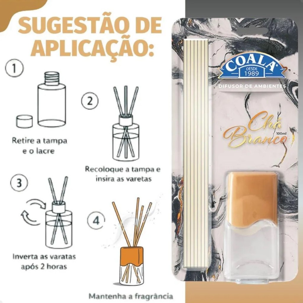 ESSE KIT CONTÉM: 3- DIFUSOR DE AROMAS COALA CHÁ BRANCO 100ML Coala Difusor de Aromas Coala é um excelente aromatizador de ambientes, mantendo o perfume por mais tempo. Além de garantir o aroma, o jogo de varetas que acompanha o produto compõe com o frasco e decora o ambiente com design moderno. Com a variedade de fragrâncias é possível variar o uso entre os ambientes, garantindo sensações únicas em cada um Modo de usar: - Retire a tampa, remova o lacre e recoloque a tampa externa. Em seguida, coloque as varetas no frasco, para que absorvam o perfume. Na primeira vez, após duas horas inverta as varetas. Caso queira interromper o uso, basta retirar as varetas e fechar o frasco No primeiro uso: - Retire a tampa, remova o lacre e recoloque a tampa externa. Em seguida, coloque as varetas no frasco, para que absorvam o perfume. Após duas horas inverta as varetas. No decorrer dos dias: - Um dos fatores que podem fazer o perfume no ambiente ficar fraco são as varetas secas. Sempre que o aroma perder a intensidade inverta as varetas para que elas fiquem umedecidas e haja maior liberação da fragrância. Para controlar a fragrância: A intensidade da fragrância pode ser controlada pela quantidade de varetas inseridas no difusor: com menos varetas o perfume liberado será mais suave. Para manter o ambiente com aroma mais intenso, utilize todas as varetas que acompanham o seu Difusor de Aromas Coala. Caso queira interromper o uso, basta retirar as varetas e fechar o frasco. Cuidados Extra: A duração do produto é diretamente influenciada pelas condições climáticas como calor, frio e exposição ao sol. Em ambientes grandes, pode ser necessário dois ou mais difusores. É recomendado não deixar próximo a saídas de ar condicionado, janelas e cortinas. É importante manter o difusor em um local fora do alcance de crianças e de animais de estimação.