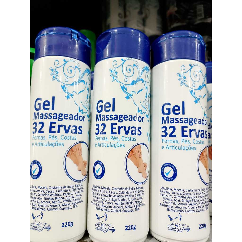 Gel Massageador 32 Ervas 220g Pernas Costas e Ar.ti.cu.la.ções O gel massageador 32 ervas foi elaborado com uma combinação perfeita de 32 extratos vegetais que confere hidratação, suavidade e refresco para a pele além de propiciar alívio à sensação de cansaço físico nas pernas, pés, costas e articulações.