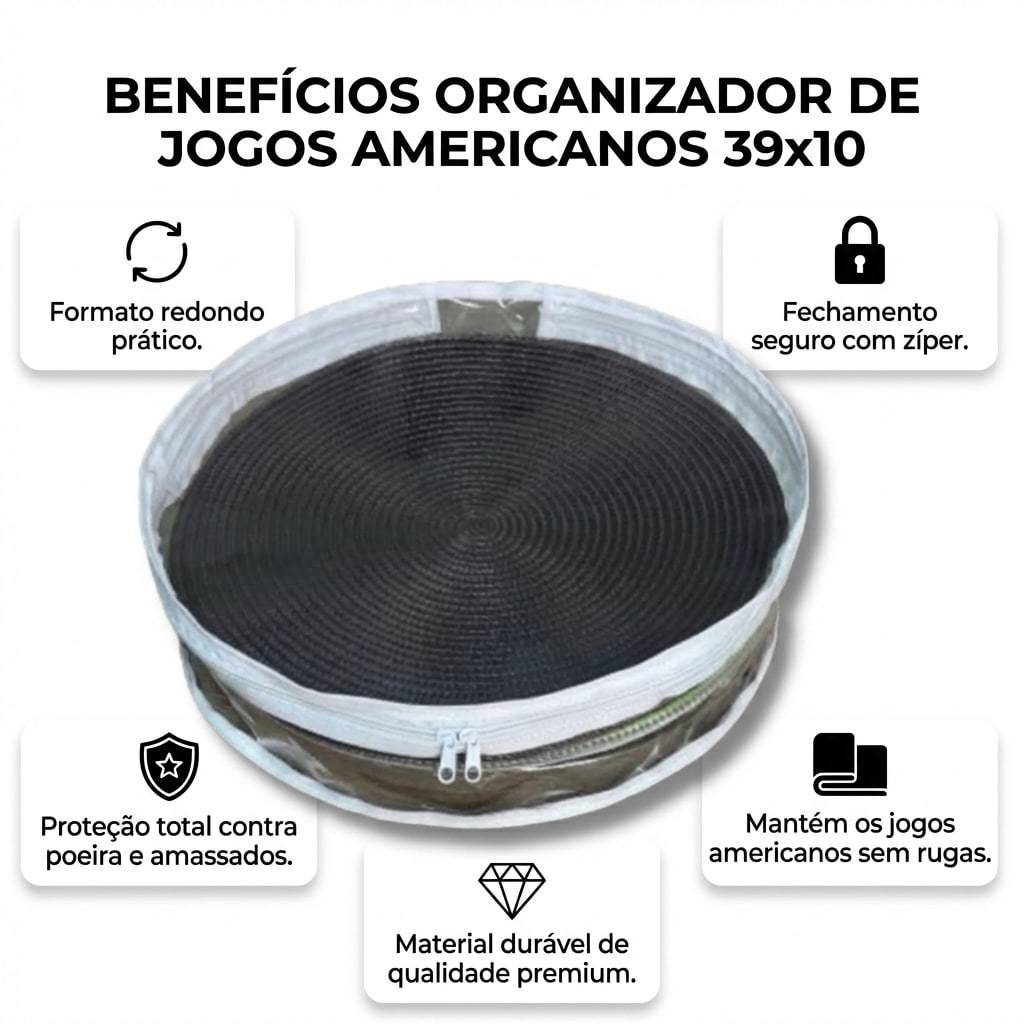 Kit com 3 Organizadores para Souplast Redondo 39x10 Premium Mantenha seus souplats, jogos americanos e acessórios sempre bem organizados com este kit com 3 organizadores redondos premium. Práticos, versáteis e funcionais, eles são ideais para facilitar a rotina e ajudar na conservação das peças, evitando amassados e bagunça. Com 39 cm de circunferência e 10 cm de altura, oferecem ótimo espaço interno para armazenar souplats, jogos americanos, chapéus, acessórios e até itens de viagem. Seu formato redondo e o acabamento em plástico resistente com detalhe em gorgorão garantem um visual bonito e uma excelente durabilidade. Além de organizar, este modelo é multifuncional, podendo ser usado em diferentes ambientes da casa, como armários, closets, quartos e até para transporte de objetos leves. Cada organizador suporta até 5 kg, unindo praticidade, resistência e elegância no dia a dia. Destaques do produto: - Kit com 3 unidades - Medida: 39 x 10 cm - Formato redondo - Material: plástico e gorgorão - Ideal para souplats, jogos americanos, chapéus e acessórios - Modelo premium, bonito e funcional - Suporta até 5 kg - Ótimo para organização e armazenamento Perfeito para quem busca mais organização, praticidade e cuidado com seus itens.