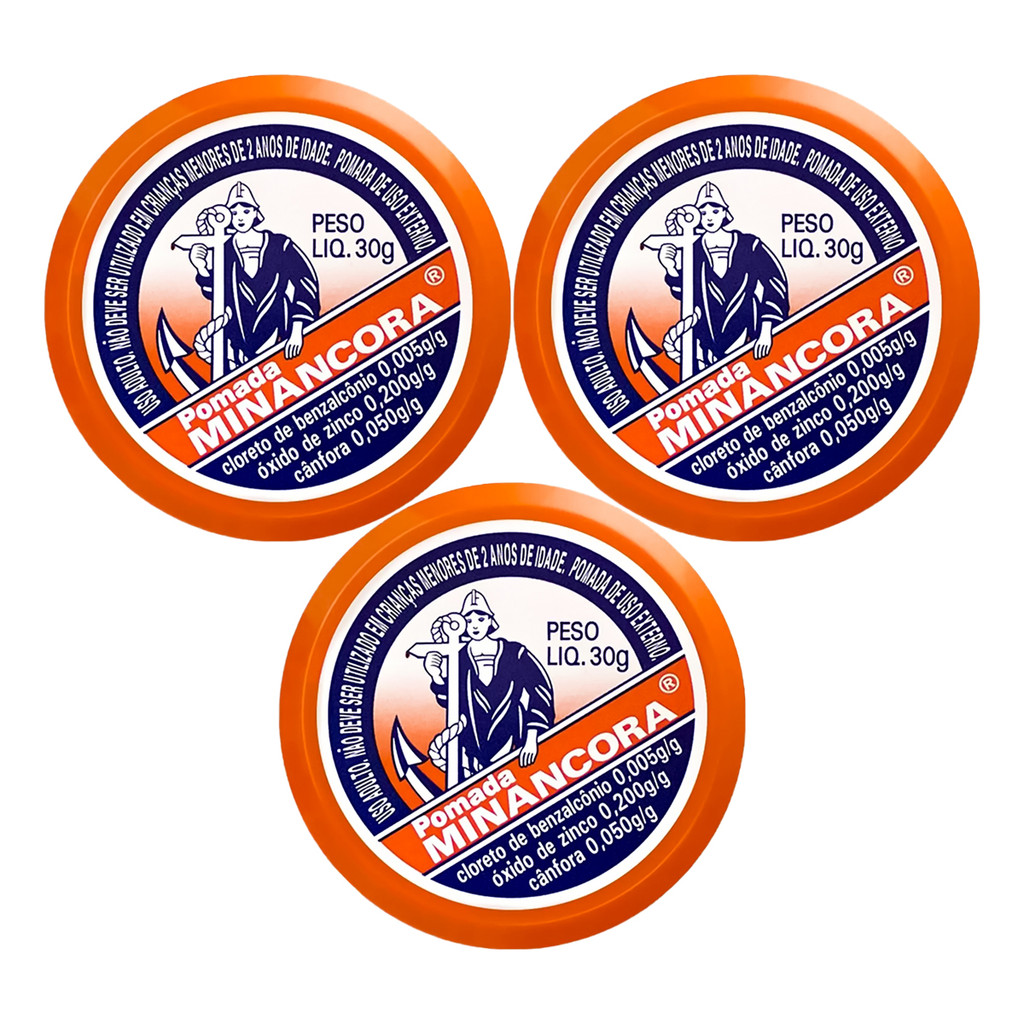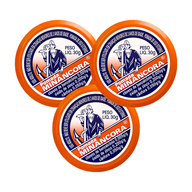 Kit C/3 Pomada Minancora 30g A Pomada Minancora é um cicatrizante, antisséptico e adstringente para tratar e prevenir doenças da pele como espinhas, frieiras, escaras e como coadjuvante no tratamento de picadas de insetos, urticárias e pequenos ferimentos superficiais. Além disso, também pode ser utilizado para prevenir odores desagradáveis nos pés e axilas ou contra o ressecamento da pele. Benefícios: - Antisséptico: Utilizado para inibir a proliferação de microorganismos presentes na superfície da pele. - Adstringente: Contrai os tecidos da pele, reduzindo as secreções e formando uma camada protetora, contribuindo para a diminuição da inflamação. - Cicatrizante: produto que favorece a cicatrização. Com a pele limpa e seca, aplique uma camada da Pomada Minancora que seja o suficiente para cobrir a região afetada a cada 12 horas, ou seja, duas vezes ao dia. A função antisséptica da pomada Minancora evita a proliferação de microorganismos presentes na superfície da pele, enquanto a função adstringente cria uma camada protetora e contribui para a diminuição da inflamação.