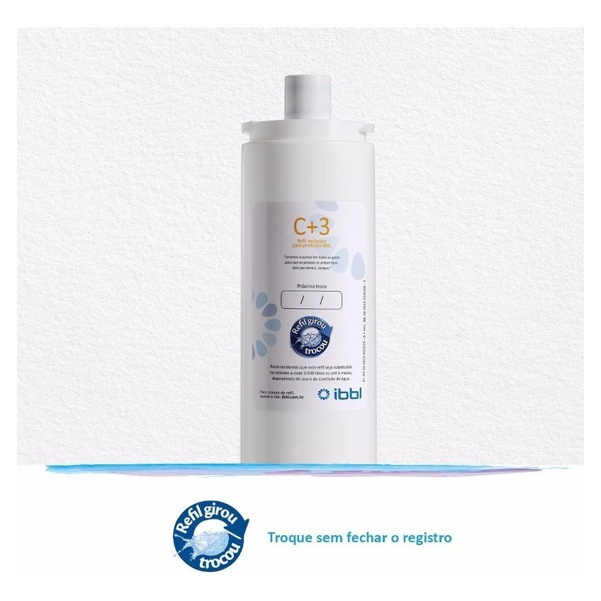Refil C+3 Girou Trocou FR-600 / FRQ-600 / ATLANTIS / PFN2000 / PFQ2000 / BDF Conta com um moderno sistema de TRIPLA FILTRAGEM, que retém as impurezas da água em 3 Etapas , este filtro apresenta o sistema “Girou, Trocou”, por meio do qual o próprio consumidor pode facilmente trocar o refil. Características da Unidade de Purificação O Refil Girou Trocou C+3 possui o sistema de TRIPLA FILTRAGEM, que retém as impurezas da água como barro, ferrugem e sedimentos; eliminando odores e sabores de cloro. Prático sistema refil GIROU TROCOU garante ao usuário uma fácil substituição do refil e manutenção do equipamento. Características Técnicas Tripla filtragem: Primeira Etapa: Elemento filtrante de microfibra de polipropileno de densidade graduada; • Benefícios: Retenção de partículas de areia, barro, ferrugem e sedimentos; Segunda Etapa: Carvão ativado com prata; Benefícios: Elimina odores e sabores de cloro, além de impedir a proliferação de microorganismos; •Terceira Etapa: Elemento filtrante de microfibra de polipropileno de densidade graduada; • Benefícios: Clarificação final de água e retenção de partículas que conseguiram passar pela 1ª etapa. Recomendamos que o refil seja substituído no máximo a cada 6 meses, dependendo do uso e da condição da água. Produto a ser utilizado com água potável, de acordo com Portaria 518/2004 do MS. Este produto atende a norma NBR 14908. Eficiência na retenção de partículas Classe (P) III, tamanho da partícula (µm) > 5 a < 15 Eficiência na retenção de Cloro Livre Classe (C) I, % de redução de cloro > 75% *Vida útil para retenção de cloro = 3.000 litros Conteúdo da Embalagem: 01- Refil C+3 Girou Trocou