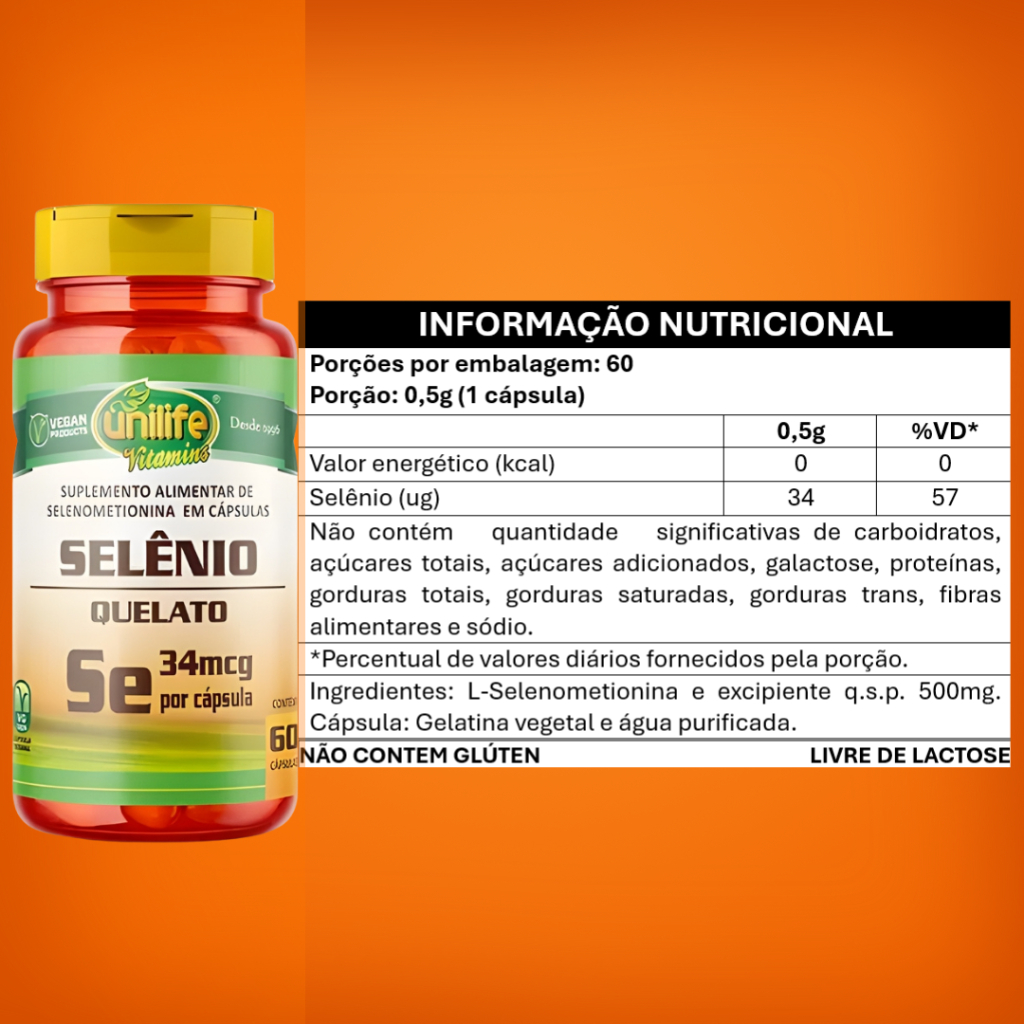 KIT Com 3 unidades de Selênio Quelato Se 500mg 60 Caps Vegano Unilife Cada pote Contém 60 cápsulas Veganas (Enviamos com a validade entre 18-24 meses - Acompanha Nota fisca) Produto de origem Mineral, Cápsula Vegana feito com produtos Vegetais/Sintéticos/ Cápsulas com certificação Kosher e Halal. Não Contém Glúten e Lactose SELÊNIO – é um elemento químico encontrado em grandes quantidades na natureza, porém, absorvido em pequenas quantidades no organismo. BENEFÍCIOS: tem função parecida com a vitamina E; antioxidante, melhora o funcionamento da tireóide, sistema imunológico Imagens Meramente Ilustrativas/ Exemplificativas/Produto autorizado para comercialização conforme anexo I da RDC 27/2010 RDC 23/2000 RDC 240/2018 da Anvisa, aut. MS. 6.02234-1