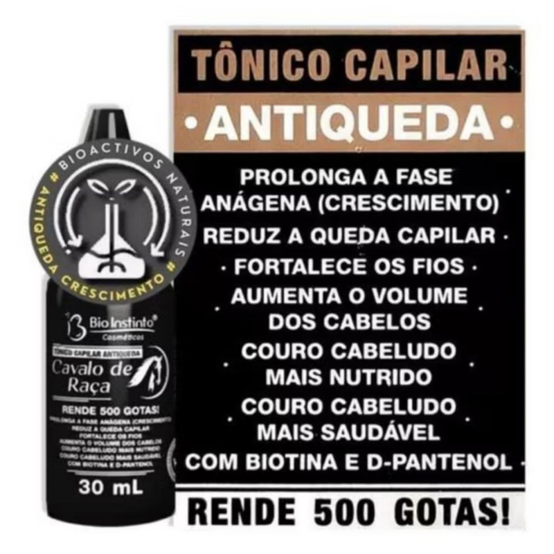 A Direta Distribuidora, a mais de 5 anos representando oficialmente diversas marcas conceituadas no mercado, atendendo com respeito e atenção, apresenta: A queda e afinamento capilar ocorrem porque os cabelos se mantêm em fase de repouso por mais tempo que o normal. Para melhora da saúde e força dos cabelos, a fase de "REPOUSO" do folículo deve ser encurtada e a fase de crescimento estimulada. O Tônico Antiqueda Cavalo de Raça penetra no Bulbo capilar e regula as fases do crescimento (Anágena, Catágenae Telógena), reduzindo a fase CATÁGENA e aumentando a fase ANÁGENA. A fase anágena é a fase de crescimento do cabelo. A fase catágena é a fase de transição. A fase telógena é a fase de descanso. BENEFÍCIOS: - Prolonga a fase de crescimento do cabelo - Reduz a queda capilar - Fortalece os fios - Aumenta o volume dos cabelos - Couro cabeludo mais nutrido - Couro cabeludo mais saudável Nossas linhas de produtos vão com plásticos e fita adesiva nas tampas para evitar vazamento no transporte, exceto produtos vedados de fábrica. Todos os produtos têm registro na anvisa para sempre respeitar a saúde de nossos clientes. Postamos os pedidos no próximo dia útil após a confirmação do pagamento. Agradecemos o interesse e nos colocamos a disposição para eventuais dúvidas.