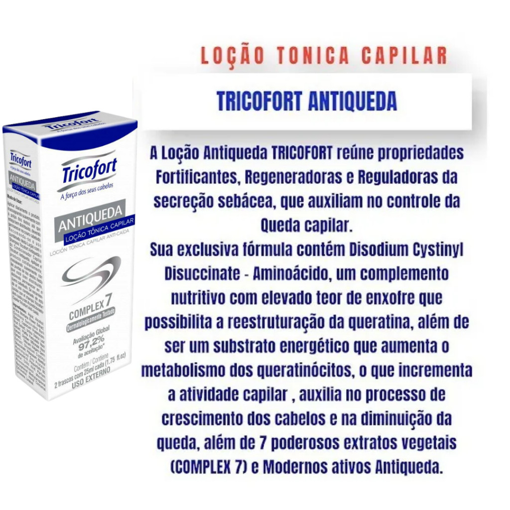 Tricofort Antiqueda Loção Tônica Capilar C/2 Ampolas 20ml Obs: Todos os nossos produtos acompanham Nota Fiscal Original LACRADO E COM GARANTIA A Loção Antiqueda TRICOFORT reúne propriedades Fortificantes, Regeneradoras e Reguladoras da secreção sebácea, que auxiliam no controle da Queda capilar. Sua exclusiva fórmula contém Disodium Cystinyl Disuccinate – Aminoácido, um complemento nutritivo com elevado teor de enxofre que possibilita a reestruturação da queratina, além de ser um substrato energético que aumenta o metabolismo dos queratinócitos, o que incrementa a atividade capilar , auxilia no processo de crescimento dos cabelos e na diminuição da queda, além de 7 poderosos extratos vegetais(COMPLEX 7) e Modernos ativos Antiqueda. Principais Benefícios: - Limpeza Profunda do Couro Cabeludo, - Regenera os fios, - Regula a Oleosidade, - Nutre a raiz dos Cabelos, - Estimula o Crescimento Capilar Estudos Clinicos comprovam 97,2% de aprovação. Contém: 03 - Tricofort Antiqueda Loção Tônica Capilar C/2 Ampolas 20ml GARANTIA DO PRODUTO Este produto conta com a garantia de 30 dias a contar da data de recebimento. Todos os produtos são conferidos para evitar transtornos futuros.
