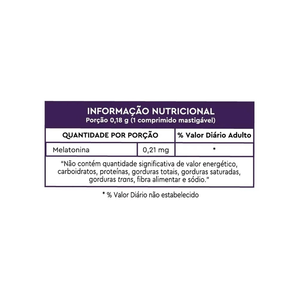 A Melatonina é um hormônio que só é ativado quando não há estímulos luminosos, ou seja, a produção de melatonina só ocorre à noite, induzindo o sono. Por isso, na hora de dormir, é importante evitar a luminosidade e outros estímulos que possam acelerar o metabolismo e diminuir a produção de Melatonina. Geralmente, a produção deste hormônio diminui com o envelhecimento e é por isso, que os distúrbios de sono são mais frequentes em adultos ou idosos. Por isso é super importante que seja feita a Suplementação Alimentar com a Melatonina, regulando assim o nível do hormônio. Modo de uso: 1 comprimido ao dia, 30 minutos antes de dormir. Ingredientes: Melatonina, agente de massa sorbitol, antiumectante dióxido de silício, aromatizante, corante vermelho 40 e edulcorante sucralose. Não contém açúcares e lactose. Recomendações e Orientações: Não exceder a recomendação diária de consumo indicada na embalagem. Pessoas com enfermidades e/ou sob o uso de medicamentos, consulte um médico. Advertência: Mantenha fora do alcance de crianças. Este produto não deve ser consumido por gestantes, lactantes, crianças e pessoas envolvidas em atividades que requerem atenção constante. Este produto não é um medicamento.
