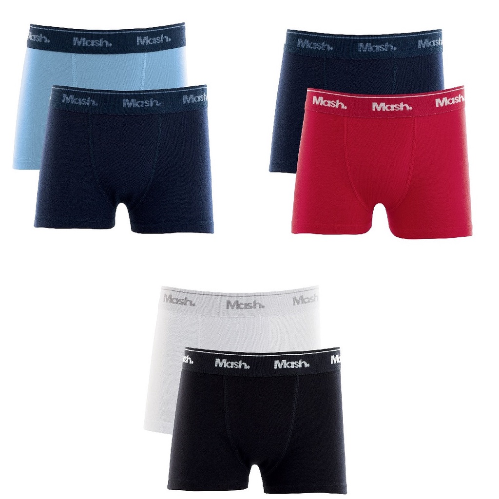 DESCRICAO: KIT COM 4 CUECAS BOXER INFANTIL COM TODOS OS BENEFICIOS DO ALGODAO. SAO 2 KITS COM DUAS CUECAS CADA. Descricao do Produto: Elastico repetitivo com padrao consagrado da Mash; Diversas cores para variar durante a semana no modelo boxer; Fibra em algodao garante durabilidade e conforto. Composicao: 100% algodao. Cores: KIT 1 ( Azul Marinho + Azul Claro); KIT 2 ( Azul Marinho + Vermelho); KIT 3 ( Preto + Branco ). Tamanho/Numeracao P - de 2 a 4 anos M - de 5 a 7 anos G - de 8 a 10 anos GG- de 11 a 13 anos