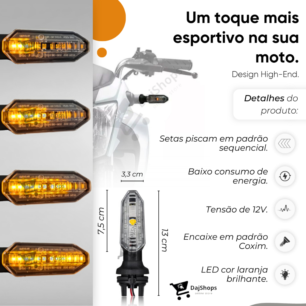 Pisca de Led Sequencial modelo CB 250F Twister /Seta Cb250 Twister Sequencial Titan Fan Start 160 **** ATENÇÃO NAS VARIAÇÕES **** Temos opçoes com 02 Unidades (par), 04 Unidades (02 pares) *** ENVIO IMEDIATO!!!*** ***COM NOTA FISCAL*** Transforme a aparência e a segurança de sua moto com a Pisca de Led Sequencial Seta para Cb Twister e Cg Titan 160 . Projetado para oferecer um visual moderno e um desempenho superior, para uma instalação completa e uniforme. ----------------------------------------------------------------------------------------------------------- Principais características: Características: Iluminação Sequencial: Tecnologia de LED com efeito sequencial, proporcionando uma sinalização mais clara e estilosa. Compatibilidade: Desenvolvido especificamente para os modelos Cb Twister e Cg Titan 160, garantindo um encaixe perfeito e uma instalação sem complicações. Design Moderno: Atualize sua moto com um design contemporâneo que combina funcionalidade e estética. Alta Visibilidade: LEDs de alta intensidade que aumentam a visibilidade, contribuindo para uma condução mais segura, especialmente à noite ou em condições de baixa luminosidade. Durabilidade: Fabricado com materiais de alta qualidade para uma longa vida útil e resistência às condições climáticas. Design à Prova D'água: Fabricado com materiais resistentes e um design à prova d'água, o kit de setas LED é resistente e capaz de suportar diversas condições climáticas, garantindo um desempenho consistente em qualquer situação. Fácil Instalação: O kit é projetado para uma instalação simples e rápida, compatível com o sistema elétrico da CB Twister e CG Titan. Inclui um manual de instruções detalhado para facilitar o processo de instalação, tornando-o acessível mesmo para aqueles com pouca experiência em mecânica. ----------------------------------------------------------------------------------------------------------- Modelo • CB Twister 250F 2016, 2017, 2018, 2019, 2020, 2021, 2022, 2023 • CG Titan, Fan 125 Fan 150 Fan 160 2014, 2015, 2016, 2017, 2018, 2019, 2020, 2021, 2022, 2023 • CG Titan, Start 160 2014, 2015, 2016, 2017, 2018, 2019, 2020, 2021, 2022, 2023 MODELO ORIGINAL PARA TITAN 160 / FAN 160 DE 2015 A 2022 ----------------------------------------------------------------------------------------------------------- Especificações: • Consumo baixo, como todo pisca de LED; • Carcaça em ABS de alta resistência; • Pisca com LEDS de alto brilho; • Fonte de luz: LED Laranja; • Conexão: 2 fios; • Não acompanha relê! • Excelente Design • Excelente Acabamento • Fácil Instalação na Moto • Encaixe Perfeito • Produto elaborado com material de alta qualidade, testado e aprovado dentro das normas de segurança • Novo, lacrado na caixa; • Garantia de FÁBRICA • Acompanha NOTA FISCAL ---------------------------------------------------------------------------------------------------------- Especificações: Cor da Luz: Âmbar Tensão: 12V Tipo de Conexão: Plug and Play, facilitando a instalação ---------------------------------------------------------------------------------------------------------- Instalação: A instalação é simples e rápida, sem necessidade de modificações extensas. Basta substituir as piscas antigas pelos novos, conectar os fios nos terminais protetores e prontos! Ideal para quem busca uma melhoria visual e funcional na moto sem complicações ----------------------------------------------------------------------------------------------------------- Benefícios Adicionais: Estilo Personalizado: Além dos benefícios funcionais, o kit fornece um toque de estilo personalizado para sua moto, destacando-se entre os demais veículos na estrada. Economia de Energia: Os LEDs de alta eficiência energética são projetados para a economia de energia da moto, permitindo que você desfrute de uma iluminação distinta sem comprometer o desempenho elétrico. O Kit de Seta LED Sequencial para Moto CB Twister e CG Titan é a escolha ideal para motociclistas que buscam aprimorar a segurança, a visibilidade e o estilo de suas motos. Combinando funcionalidade e design inovadores, este kit é uma atualização impressionante para qualquer entusiasta de motocicletas. FUNCIONARÁ PERFEITAMENTE SEM A INSTALAÇÃO DE UM RELE DE LED, MAS O PISCA IRÁ FUNCIONAR UM POUCO MAIS RÁPIDO QUE O NORMAL. PARA O PISCA PISCAR NA VELOCIDADE CERTA, BASTA INSTALAR UM RELÊ DE LED