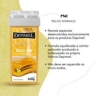 A Cera depilatório roll-on Depimiel foi criada especialmente para agilizar o processo de depilação em salões de estética, profissionais de beleza e por depiladoras. A cera Depimiel possui sistema roll-on para deslizar facilmente pela pele, proporcionando precisão, eficiência e maior economia. A cera de depilação Clássica contem ingredientes a base de mel com aderência equilibrada, indicada para pelos normais. O mel e um ingrediente natural rico em vitaminas e enzimas com poder restaurador e rejuvenescedor para a pele. Proporciona limpeza profunda enquanto hidrata e nutre gradativamente para deixar a pele macia e saudável. A cera e 100% descartavel para garantir higiene e bem estar, devendo ser usada 1 única vez por cliente. Conselho de Aplicação 1) Aqueça o roll-on no Aquecedor DEPIMIEL por 25 a 30 min. 2) Limpe a pele com a Loção Pré-Depilatória DEPIMIEL. 3) Destrave o roll-on passando-o sobre uma folha de Lenço para Depilação DEPIMIEL até que deslize facilmente. 4) Aplique a cera sobre a pele no sentido do crescimento do pelo. 5) Coloque o Lenço para Depilação sobre a cera e friccione-o. 6) Com uma das mãos mantenha a pele esticada e com a outra puxe o lenço com firmeza e rapidez em sentido contrário ao crescimento do pelo (Puxe sempre a folha paralelamente e tão próxima da pele quanto for possível). 7) Use o Óleo Removedor Hidratante DEPIMIEL para tirar os possíveis resíduos de cera e a Loção ou Gel Pós-Depilatório DEPIMIEL para atenuar a sensibilidade da pele. PRECAUÇÕES: Siga o modo de uso. Não se exponha ao sol ou cama solar 48 horas antes e após a depilação. Puxe sempre a folha paralelamente e tão próxima da pele quanto for possível. Não remova as folhas puxando para cima, pois podem causar hematomas. Não utilize com finalidade de barbear. Não use produtos que contenham álcool antes e logo após a depilação, pois podem ocorrer irritações. Não é recomendado para gestantes, crianças, idosos, diabéticos ou após cirurgias. Não deve ser aplicado em mucosas e regiões circunvizinhas, sobre pele ferida, irritada, lesionada, inflamada, varizes, e peles que apresentaram reações negativas com uso de outra cera no passado. Não repetir a aplicação por mais de duas vezes no mesmo local. Não aplique o produto em prazo menor que 15 dias na mesma região, pois o pelo não estará no comprimento adequado para depilação. Este produto foi desenvolvido e testado para depilação, entretanto poderão ocorrer sensibilizações. Desta forma, antes de usar teste em uma pequena área. Mantenha fora do alcance das crianças. Em caso de contato com os olhos consulte um especialista. Não aqueça em micro-ondas nem em banho-maria. Uso Profissional. Uso externo. Contém 48 unidades