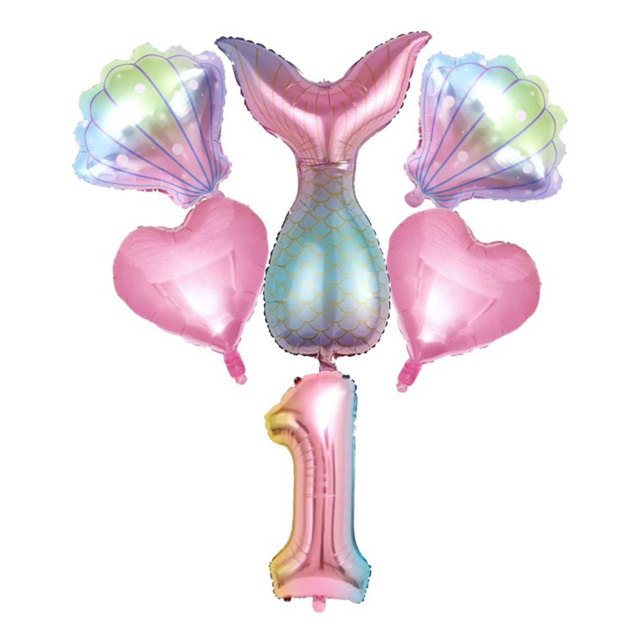 Kit c/ 5, 6 ou 7 Balão Metalizado Cauda Sereia Concha e Coração com Número Degradê Grande 75 cm Decoração