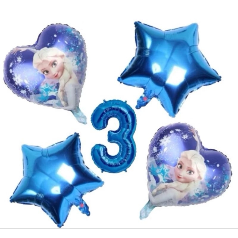 🎈 Kit c/5 Balões Metalizados Frozen Elsa Azul Coração Estrela mede 45 cm/ Número mede 40 cmFesta Infantil