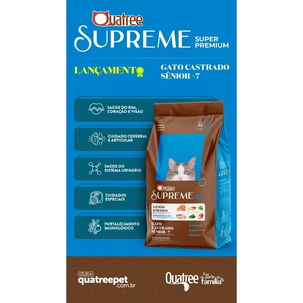 Kit Com 5 Ração Quatree Supreme Gatos Sênior +7 Frango E Salmão 1kg ( Cada Pacote Contém 1kg) Alimento Super Premium formulado com conservantes 100% naturais e livre de transgênicos, garantindo fácil digestão e absorção dos nutrientes. A combinação de proteínas selecionadas e ingredientes naturais e funcionais garante mais saúde e vitalidade para o seu gato.Farinha de vísceras de frango, farinha de torresmo, farinha de peixes, ovo em pó, gordura suína, gordura de aves, arroz quebrado, sorgo integral moído, farinha de batata doce, glúten de trigo, grão de linhaça, polpa desidratada de beterraba (mín. 1,0%), levedura de cervejaria inativada desidratada, celulose, lignocelulose, inulina (FOS) (mín. 0,15%), mananoligossacarídeo (MOS) (mín. 0,1%), cloreto de sódio, cloreto de potássio, hidrolisado de fígado de aves e suíno, hexametafosfato de sódio (mín. 0,1%), ácido fosfórico, parede celular de levedura, zeólita, extrato de yucca, taurina, metionina, lisina, L-carnitina (mín. 0,03%), tocoferol (concentrado), extrato de alecrim, maçã desidratada, extrato de chá verde, acetato de retinol (vit. A), colecalciferol (vit. D3), ácido ascórbico (vit. C), acetato de DL-alfa-tocoferol (vit. E), mononitrato de tiamina (vit. B1), riboflavina (vit. B2), cloridrato de piridoxina (vit. B6), cianocobalamina (vit. B12), bissulfito de menadiona nicotinamida (vit. K3), biotina, cloreto de colina, niacina (ácido nicotínico), ácido fólico, D-pantotenato de cálcio (ácido pantotênico), sulfato de cobre monohidratado, sulfato de ferro, sulfato de zinco, sulfato de manganês, selenito de sódio, iodato de cálcio, proteinato de manganês, proteinato de selênio, proteinato de zinco.NÍVEIS DE GARANTIAProteína Bruta (mín.) 400g/kg 40,00%Extrato Etéreo (mín.) 120g/kg 12,00%Matéria Fibrosa (máx.) 45g/kg 4,50%Matéria Mineral (máx.) 75g/kg 7,50%Cálcio (mín.) 7.000mg/kg 0,70%Cálcio (máx.) 15g/kg 1,50%Fósforo (mín.) 7.000mg/kg 0,70%Sódio (mín.) 3.500mg/kg 0,35%Potássio (mín.) 5.000mg/kg 0,50%Taurina (mín.) 1.500mg/kg 0,15%L-carnitina (mín.) 300mg/kg 0,03%Metionina (mín.) 8.500mg/kg 0,85%Lisina (mín.) 13g/kg 1,30%Magnésio (máx.) 1.000mg/kg 0,10%Ômega 6 (mín.) 18g/kg 1,80%Ômega 3 (mín.) 3.000mg/kg 0,30%Mananoligossacarídeo (mín.) 1.000mg/kg 0,10%Inulina (mín.) 1.500mg/kg 0,15%Extrato de Alecrim (mín.) 10mg/kg 0,001%Tocoferol (mín.) 900mg/kg 0,09%Umidade (máx.) 90g/kg 9,00%pH urinário 6,2-6,8 Energia Metabolizável 3.960kcal/kg