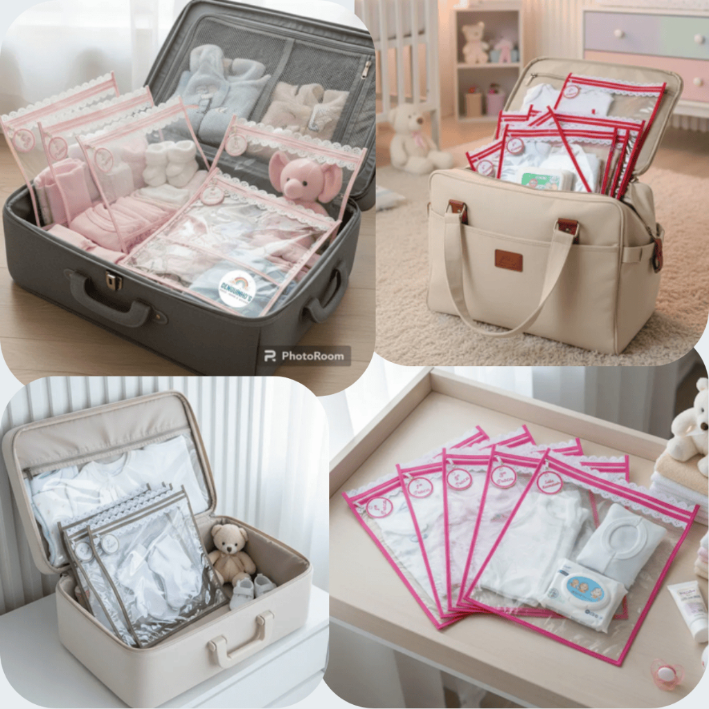 Kit c/ 5 Saquinhos Maternidade em Plástico Cristal com Zíper e Viés + TAG BORDADAS.