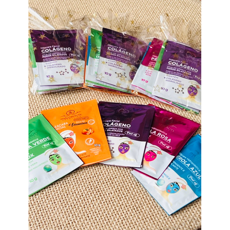 kit c/ 5un Máscara Facial 10g Esfoliante, hidratante, pérola azul, pérola verde, pérola rosa, colágeno e vitamina C