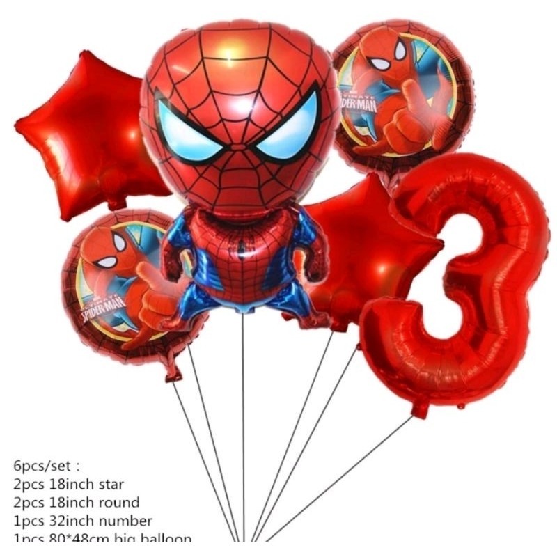 Kit c/6 balões metalizado homem aranha corpo mede 80 cm redondo estrela mede 45cm número mede 40 cm