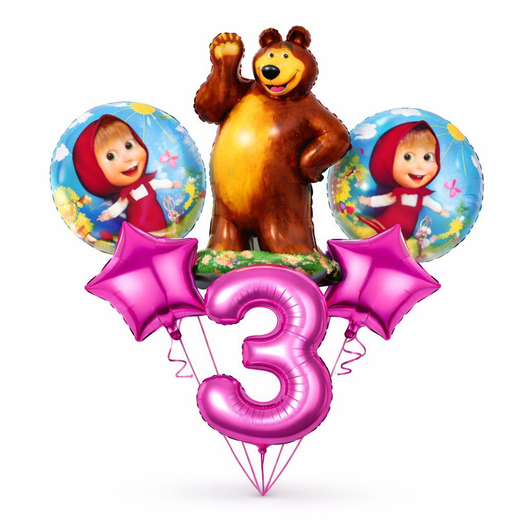 Kit c/6 balões metalizado Masha urso corpo mede 50 cm, redondo, estrela mede 45cm número mede 40 cm
