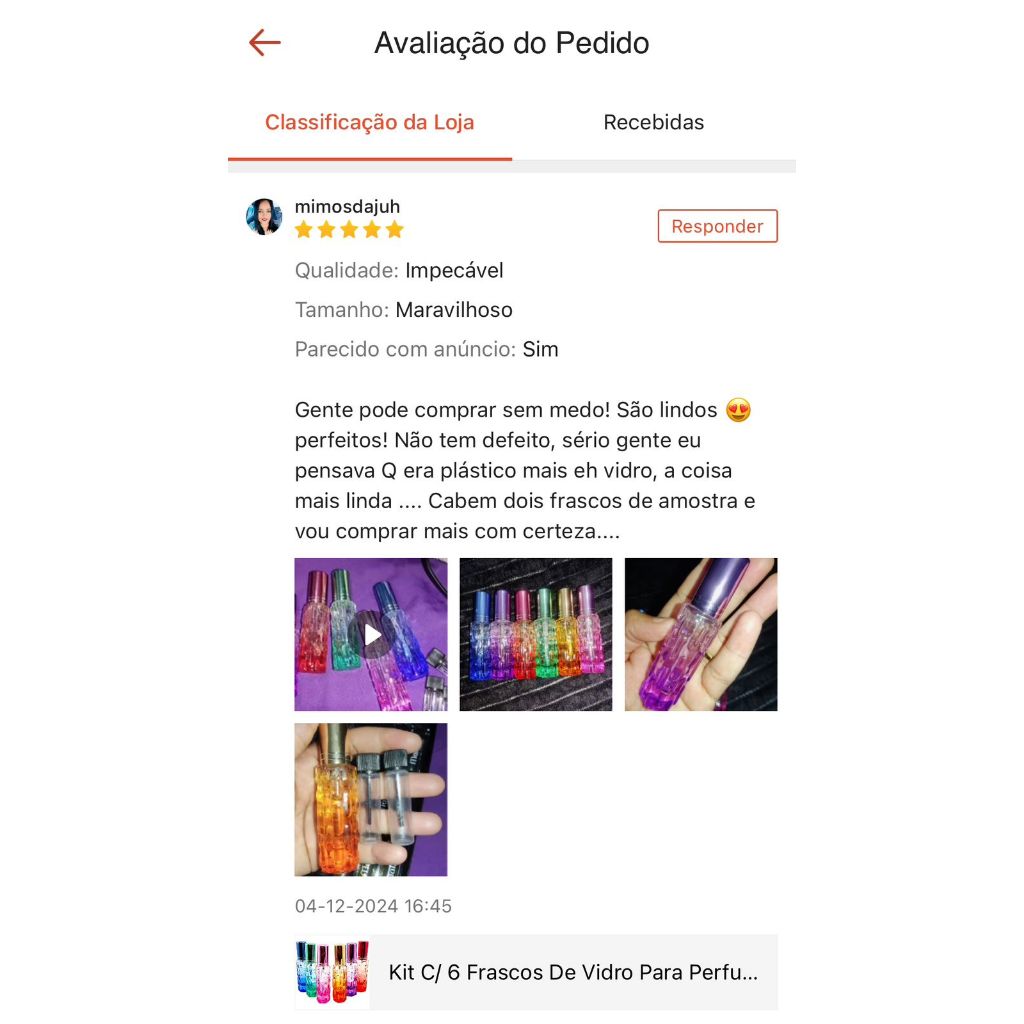 | Kit C/ 6 Frascos De Vidro Para Perfume Colorido este produto | R$ 48,90 | 16% | 5.0/5 | 3 |
