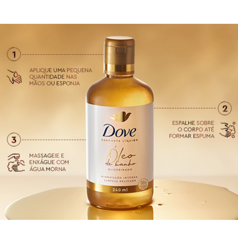 Desfrute de uma nova experiência no banho, que não apenas limpa, mas também regenera a hidratação natural da pele. Sinta a diferença do novo Dove Óleo de Banho e transforme seu ritual de cuidados diários. O segredo para uma pele bonita é a hidratação contínua e com Dove Óleo de Banho, sua pele fica visivelmente macia, radiante e nutrida. Nosso Sabonete Líquido Óleo de Banho Glicerinado contém 96% de ingredientes de origem natural, garantindo hidratação intensa, limpeza delicada e uma sensação de bem-estar após o banho. Sua fórmula suave e nutritiva limpa ao mesmo tempo em que hidrata, deixando a pele com toque sedoso e aveludado. Além disso, o Dove Óleo de Banho conta com uma textura líquida, que forma uma espuma cremosa e proporciona uma experiência envolvente, além de ser de fácil enxágue e não deixar sensação oleosa. Sua fragrância leve e sofisticada oferece uma verdadeira experiência de spa em casa e perdura na pele ao longo do dia, tornando o banho um momento de autocuidado e relaxamento premium. Para uma experiência ainda mais completa, sugerimos o seguinte modo de uso: aplique uma pequena quantidade na mão ou em uma esponja, espalhe suavemente pelo corpo até formar espuma, massageie e enxágue com água morna. Uso externo. Dove Óleo de Banho pode ser usado diariamente no corpo, mãos e rosto. Descubra um novo jeito de cuidar da pele com Dove Óleo de Banho.