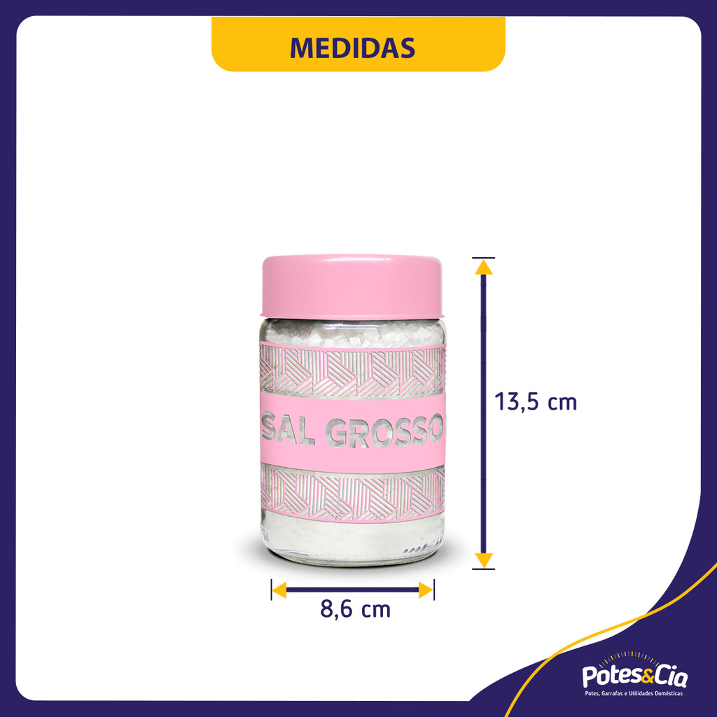 POTES & CIA - Potes, Garrafas e Utilidades Domésticas em Vidro CONTEÚDO DA CAIXA: 7 potes de vidro 600ml com estampas das seguintes utilidades: • Temperos • Sal • Sal grosso • Churrasco • Orégano • Queijo • Alho DESCRIÇÃO / INFORMAÇÕES TÉCNICAS DO PRODUTO: - Capacidade útil: 600ml - Cor: Transparente/Incolor - Altura: 135mm - Diâmetro (Máximo): 86mm - Tampa: Plástica Rosa - Peso unit.: 190grs INFORMAÇÕES IMPORTANTES: **** >> EMBALAGEM - A caixa está preparada para logística com separadores entre os potes, dificultando a quebra dos itens no envio. >> AVARIAS/DIVERGÊNCIAS - Caso aconteça avarias ou divergências com o pedido, orientamos entrar em contato com nosso SAC através do campo de mensagens, não sendo necessário a abertura de RECLAMAÇÕES. Fique tranquilo pois temos uma política de análise e resolução rápida destes tipos de problemas para que fique satisfeito com sua compra e com nosso atendimento. >> FRETE - Nossos pedidos são enviados diariamente para garantir rapidez e segurança no transporte de sua mercadoria; No dia seguinte ao envio o sistema irá liberar o código de rastreamento e você conseguirá acompanhar a sua entrega via sistema. ** OBSERVAÇÕES: ** - NÃO é possível alterar a cor da tampas e/ou estampas. - A estampa é serigrafada no vidro, não sendo possível removê-la. >> ORIENTAÇÕES DE USO: - Para conservar os aspectos e garantir a durabilidade do produto: limpar com água e detergente neutro. Não usar solventes ou produtos abrasivos. - O pote possui grande resistência à altas temperaturas, podendo ser levado ao micro-ondas, forno, dentre outros. Evite o choque térmico. Agradecemos sua visita e permanecemos à disposição no chat abaixo para lhe atender da melhor forma!!