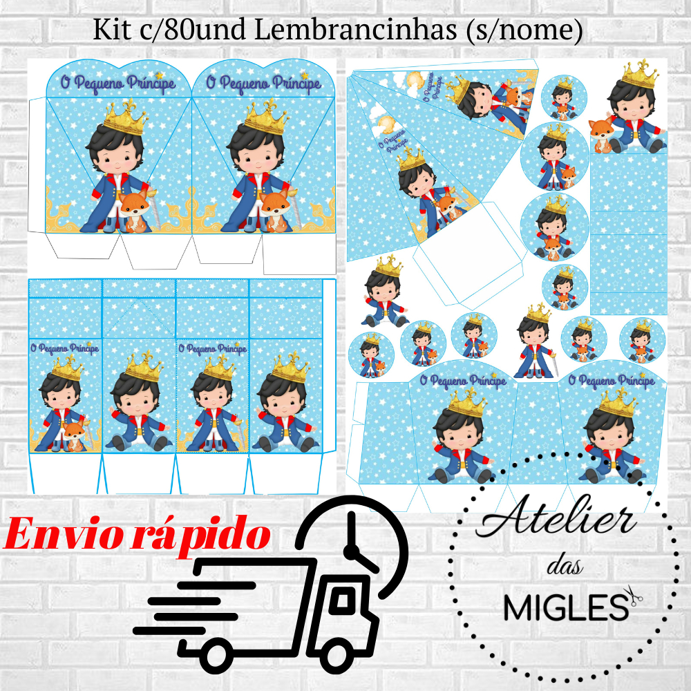 LEIA COM ATENÇÃO... LEMBRANCINHAS C/80 ITENS SEM NOME TEMA: PEQUENO PRÍNCIPE KIT TEMÁTICO COM 80ITENS DESMONTADOS, PODENDO COMPRAR QUANTOS KITS DESEJAR. Lembrando que são a cada 80 itens por promoção. ⬇️KIT SEM ALTERAÇÃO, CONTENDO: *05 CAIXAS CORAÇÃO (11CM) *05 CAIXAS MINI CACHEPÔR (8CM) *05 CAIXAS BIS DUPLO (5CM) *05 CAIXAS MILK (14CM) *05 CAIXAS PIRÂMIDES (11CM) *10 TAGS PARA LATINHAS (5CM) *10 TAGS PARA TUBETES (5CM) *35 TAGS PARA DOCINHO (2,8CM) OBSERVAÇÕES: SÃO FOLHAS SEM RECORTE (cliente recorta, dobra e cola); ENVIAMOS VÍDEO ILUSTRATIVO DE COMO MONTAR; PRODUZIDO EM PAPEL FOTOGRÁFICO 180G; NÃO ALTERAMOS MODELOS E NEM ARTE; NÃO INCLUSO LAÇO. IMPORTANTE SABER: As cores das fotos podem não representar fidelidade, podendo sofrer pequenas alterações por causa do monitor de cada computador, as cores podem variar de acordo com o brilho e contraste do seu monitor. Por se tratarem de produtos artesanais e únicos, podem ocorrer pequenas variações. As medidas porém sofrem pequenas diferenças em relação ao corte entre 1 e 2 milímetros.
