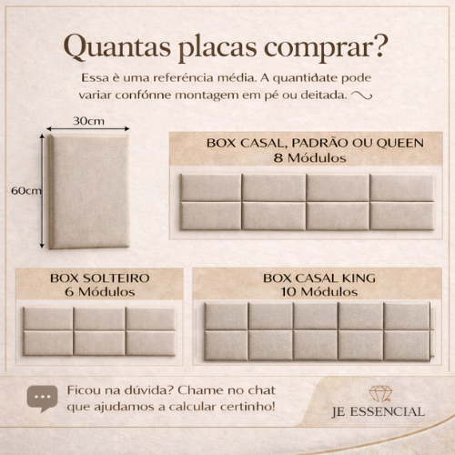 ✨ TRANSFORME SEU QUARTO EM UM AMBIENTE MAIS CONFORTÁVEL E ELEGANTE ✨ Nossas placas estofadas modulares são ideais para criar cabeceiras modernas, sofisticadas e personalizadas, valorizando qualquer projeto de quarto. 🏆 Sobre a JE Essencial A JE Essencial nasceu da experiência da JE Cabeceiras, nossa linha principal de cabeceiras sob medida. Há anos no mercado, a JE Cabeceiras desenvolve projetos personalizados e já participou de produções para emissoras de televisão e projetos com arquitetos, sempre com alto padrão de acabamento. Com a JE Essencial, trouxemos a mesma qualidade de fabricação em um formato modular, prático e acessível, pensado para quem quer transformar o quarto de forma rápida e sem complicação. 📌 IMPORTANTE Este anúncio corresponde a 01 (uma) placa estofada no tamanho 60x30cm. As placas podem ser combinadas entre si para montar cabeceiras de cama solteiro, casal, queen ou king, conforme a quantidade adquirida. Não sabe quantas placas comprar? 👉 Fale conosco pelo chat da Shopee. Somos fabricantes e temos atendentes prontos para orientar e ajudar a calcular a quantidade ideal para o seu espaço. 📦 CONTEÚDO DA EMBALAGEM ✔️ 01 Placa estofada modular 60x30cm ✔️ Fita adesiva 3M para instalação 📐 SUGESTÃO DE QUANTIDADE (referência média) 🛏️ Solteiro: 3 placas 🛏️ Casal: 6 placas 🛏️ Queen: 8 placas 🛏️ King: 8 placas 📌 Essas quantidades são apenas indicativas. Para um encaixe perfeito no seu projeto, fale com nosso atendimento no chat. 💎 POR QUE ESCOLHER NOSSAS PLACAS? ✅ Produção própria (direto da fábrica) ✅ Acabamento estofado de alto padrão ✅ Espuma macia, confortável e resistente ✅ Indicado para: -Cabeceiras de cama -Encosto tipo canto alemão -Painéis decorativos ✅ Fixação prática com fita 3M 🛠️ ORIENTAÇÕES DE INSTALAÇÃO ✔️ Instalar sobre parede limpa, seca e lisa ✔️ Recomendado o uso de nível para alinhamento correto ❌ Não indicamos aplicação em paredes com textura, grafiato ou relevo 🧱 MATERIAIS UTILIZADOS 🔹 MDF 6mm 🔹 Espuma D20 – 3cm 🔹 Tecidos disponíveis: -Courvin Facto -Veludo -Linho -Suede 🔹 Fita adesiva autocolante 3M 🛡️ GARANTIA E SEGURANÇA ✔️ Produto revisado e testado antes do envio ✔️ 30 dias de garantia contra defeitos de fabricação ✔️ Em caso de avaria ou defeito, realizamos reembolso total ✨ Adquira a quantidade ideal e crie o projeto que você imaginou. \\\\\\\\\\\\\\\\\\\\\\\\\\\\\\\\\\\\\\\\\\\\\\\\\ZZZ\\\\\\\\\\\\\\\\\\\\\\\\\\\\\\\\\\\\\\\\\\\\\\\\\\\\\\\\\\\\\\\\\\\\\\\\\\\\\\\\\\\\\\\\\\\\\\\\\\💬 Somos fabricantes — qualquer dúvida, chame no chat. Nosso time está pronto para ajudar!