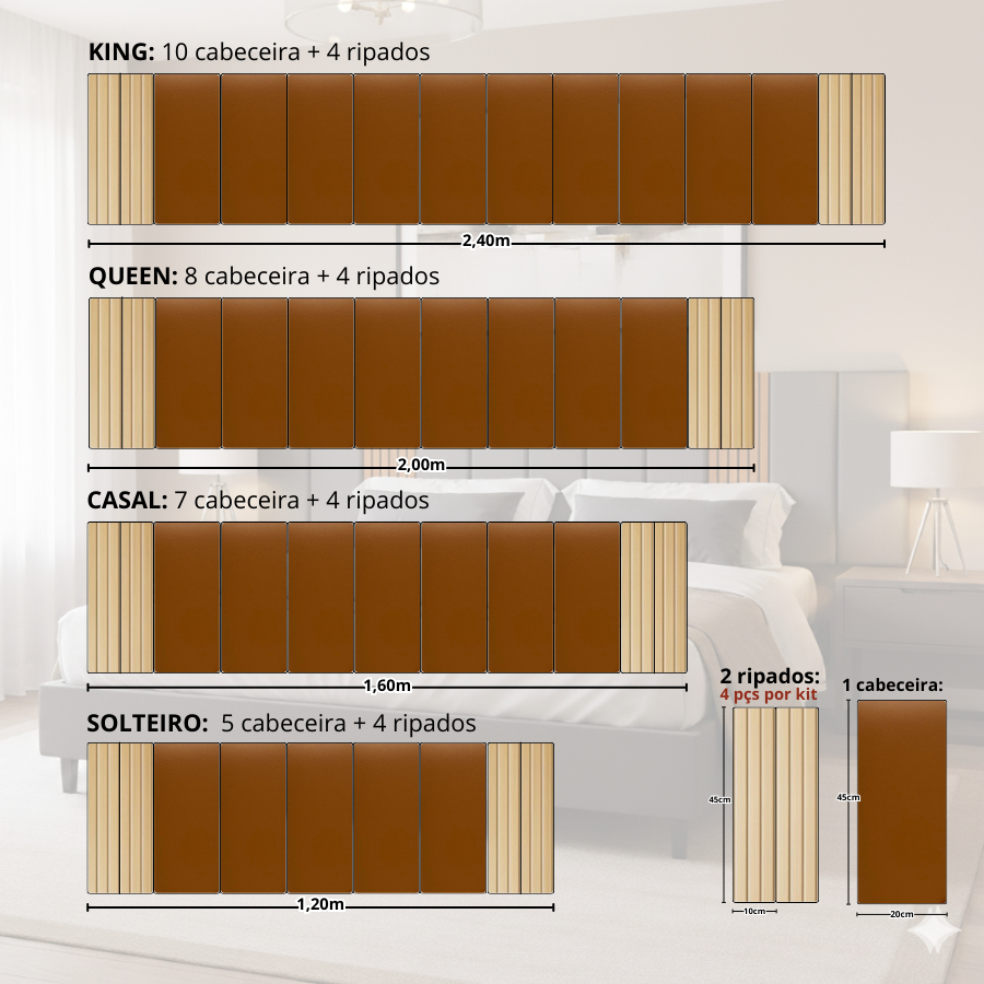 🛏️ Cabeceira Estofada Modular em Courino (Corino) + Ripado MDF Design moderno e elegante para cama box solteiro, casal, queen ou king. Produto modular, com espuma macia, instalação sem furo e fita dupla face inclusa. Renove seu quarto com praticidade e sofisticação. ✅ Características: • Cabeceira estofada em courino premium • Painel ripado MDF 45×10 cm • Cabeceira estofada 45×20 cm • Espuma 3 cm (mais conforto) • MDF 3 mm • Produto modular – monte como desejar • Acompanha fita dupla face premium • Instalação rápida, sem furar a parede Kit Solteiro 5 Cabeceiras + 4 Ripados Kit Casal 7 Cabeceiras + 4 Ripados Kit Queen 8 Cabeceiras + 4 Ripados Kit King 10 Cabeceiras + 4 Ripados