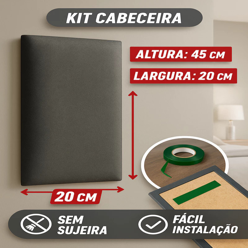 Dimensões de Cada Módulo: - Altura: 45 cm - Largura: 20 cm Quantidade Recomendada de Módulos: 5 MÓDULOS PARA - CAMA DE SOLTEIRO - 1,00mX0,45cm 7 MÓDULOS PARA - CAMA DE CASAL - 1,40mX0,45cm 8 MÓDULOS PARA - CAMA QUEEN - 1,60mX0,45cm 10 MÓDULOS PARA - CAMA KING - 2,00mX0,45cm Especificações do Produto: - Material Principal: Cabeceira MDF Premium, fabricada com melhores materiais do mercado. - Acompanhamento: Já Acompanha Fita Dupla Face Original, Garantindo Fácil fixação e Resistência. - Revestimento em tecido Suede Premium: Alta durabilidade e sofisticação. - Espuma Especial: Conforto adicional ao encostar.