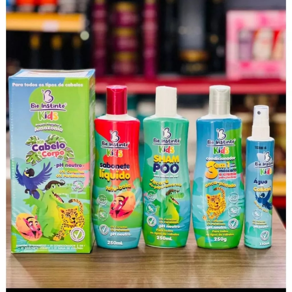 Modo de Usar: Aplique o Sabonete Líquido Tatu-Bola Bio Instinto Kids nas mãos ou esponja, massageie a pele da criança até formar espuma e enxágue completamente. Molhe o cabelo da criança com água morna e aplique o Shampoo Jacaré-do-Papo-Amarelo Bio Instinto Kids, massageando suavemente até formar espuma e enxágue. Após o uso do shampoo, aplique o Condicionador 3 em 1 Onça-Pintada Bio Instinto Kids massageando suavemente, deixe agir por 2 minutos e enxágue. O condicionador 3 em 1 pode ser utilizado como máscara de hidratação ou creme para pentear. Para efeito máscara deixe agir por 5-10 minutos e enxágue. Para efeito creme para pentear, espalhe na palma das mãos uma pequena quantidade do produto e aplique no cabelo da criança, não enxágue. Após o banho, ou a qualquer hora do dia, aplique na pele ou na roupinha da criança a Água de Colônia Arara-Azul Bio Instinto Kids. Advertências/ Restrições: Somente para uso externo. Deve ser aplicado por adulto ou sob sua supervisão. Não usar se o couro cabeludo estiver ferido ou irritado. Nunca ingerir. Em caso de irritação, suspender o uso e procurar um médico. Caso o produto entre em contato com os olhos, lavar com água corrente em abundância e procurar um médico. Conservar em temperatura ambiente inferior a 40°C, em local fresco e longe da luz solar. Manter fora do alcance de crianças e animais domésticos.