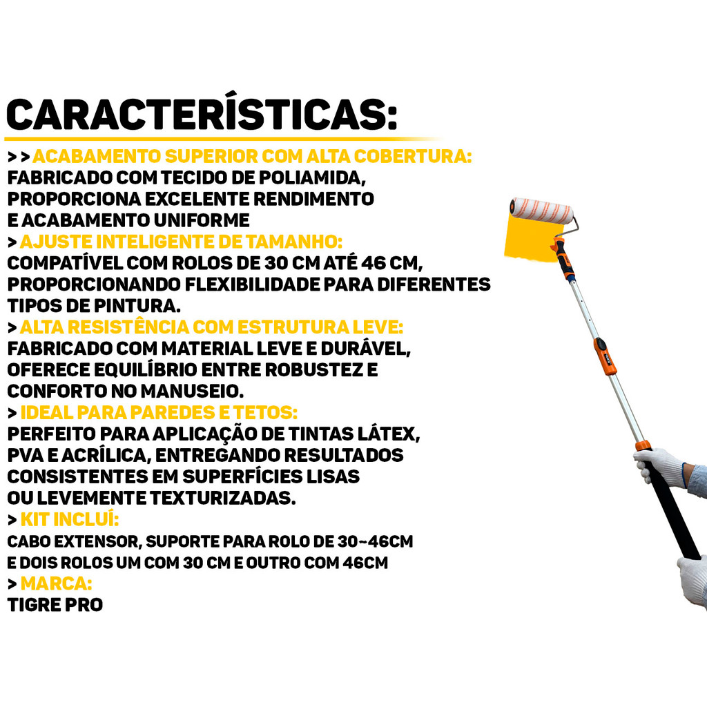 Kit Cabo Extensor 1,5 Metros + 2 Rolinhos 30cm 46cm Para Pintura Teto Parede Multiuso + Garfo Duplo Ajustável Tigre Pro