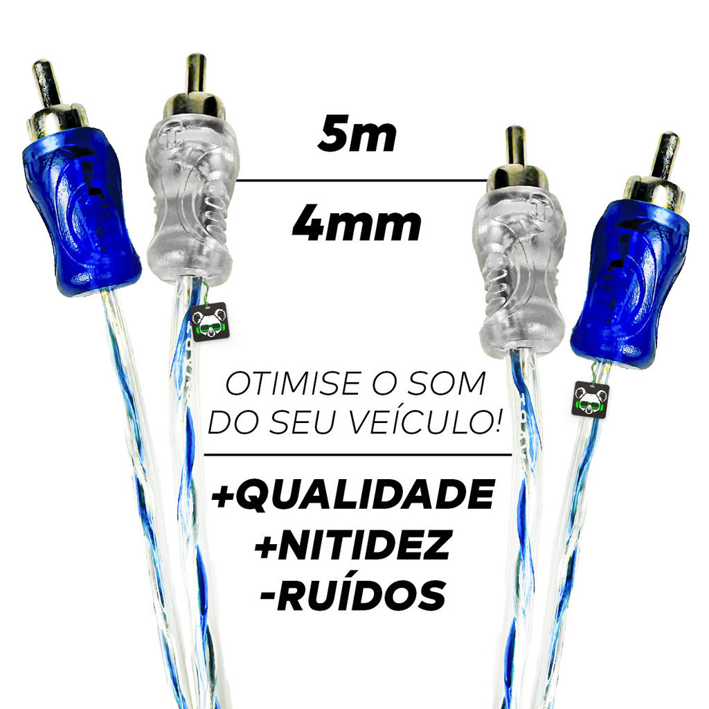Kit Cabo Rca Injetado 5 Metros Dupla Blindagem 4mm + 2 RCA Y TURBINE O SEU PROJETO DE SOM AUTOMOTIVO - Conexão de Alta Qualidade - Muito + Resistência - Menos Ruídos e Interferências. DUPLA BLINDAGEM Garante resistência e durabilidade. PLUGUES DE METAL BANHADOS A NÍQUEL Aumenta a qualidade da transmissão sonora. REVESTIMENTO EM PVC FLEXÍVEL E TRANSPARENTE Evita a quebra e aumenta a durabilidade do cabo, facilitando a instalação. PERFEITA EXTENSÃO Transforme 1 entrada em 2 saídas sem perda de qualidade. ESPECIFICAÇÕES TÉCNICAS CABO 5 METROS 4MM - Conector: RCA - Diâmetro: 4mm - Tamanhos: 5M - Plugs de metal banhados a níquel - Dupla blindagem - Revestimento em PVC flexível e transparente - Cores: Azul e Prata CABO Y 30CM 4MM - Conector: RCA - Tipo: Y (1x fêmeas | 2x machos) - Diâmetro: 4mm - Tamanhos: 30cm - Plugs de metal banhados a níquel - Dupla blindagem - Revestimento em PVC flexível e transparente - Cores: Azul e Prata CONTEÚDO DA EMBALAGEM: - 01 Cabo RCA Injetado Azul/Prata Transparente 4mm 5M Svart - 02 Cabos Y RCA Injetado Azul/Prata 4mm 30cm Svart Recomendamos que a instalação seja feita por um profissional, não nos responsabilizamos pelo mal uso do produto.