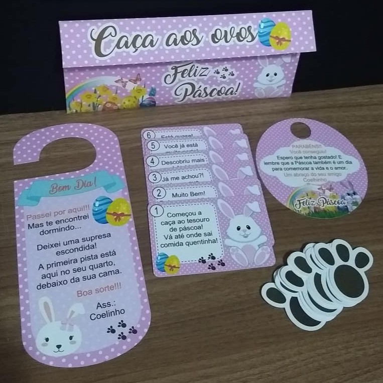 Kit Caça aos Ovos Personalizado - Páscoa - Rosa ou Azul - Com envelope para guardar Disponíveis nas cores: Rosa ou Azul. O kit contém: - 01 Sinalizador de Porta | Bom dia (que mede 16,5 cm x 7 cm) - 06 cartões: pistas para encontrar o ovo (que medem 7,5 cm x 5 cm) - 14 pegadas de coelhinho (não são adesivos, medem 4 cm x 3,8 cm) - 01 Sinalizador da Chegada ao Tesouro (que mede 7,5 cm x 8,5 cm oval) - 01 Envelope (que mede 17 cm x 8 cm) para você guardar seu kit Caça aos ovos e poder usar novamente. Material: feito e impresso em papel offset 180g, recorte eletrônico. Fotos reais do produto.