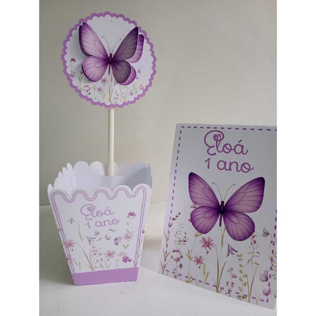 kit cachepô e Plaquinha Agradecimento Festa Borboleta Lilás | Centro de Mesa Personalizado Nome e Idade