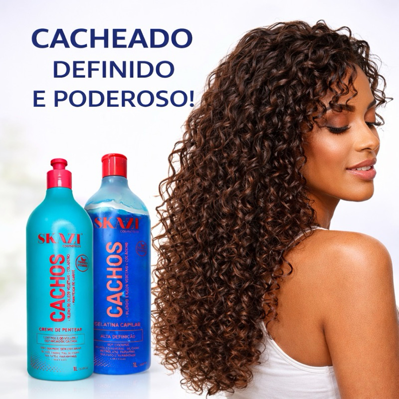Kit Cachos SKAZI – Finalização para Cabelos Cacheados O Kit Cachos SKAZI foi desenvolvido para proporcionar definição, nutrição e controle do frizz em cabelos cacheados e crespos. A combinação do Creme de Pentear com a Gelatina Capilar ajuda a modelar os cachos, garantindo mais definição, brilho e movimento natural sem pesar os fios. Ideal para quem busca cachos definidos, hidratados e com aparência saudável. ⸻ O QUE VEM NO KIT 1 Creme de Pentear Cachos SKAZI – 1 Litro 1 Gelatina Capilar Cachos SKAZI – 1 Litro ⸻ BENEFÍCIOS Nutrição intensa Definição dos cachos Brilho intenso Controle do frizz Controle do volume Modelagem duradoura ⸻ FÓRMULA LIBERADA Sem óleo mineral Sem silicone Sem petrolato Sem parafina Sem sulfato Sem parabenos Produto vegano ⸻ ATIVOS Blend de óleos vegetais Colágeno Manteiga de Karité ⸻ COMO USAR Com os cabelos limpos e úmidos, aplique o Creme de Pentear mecha por mecha. Em seguida aplique uma pequena quantidade da Gelatina Capilar para potencializar a definição dos cachos. Amasse os cabelos de baixo para cima para ativar a formação dos cachos. Deixe secar naturalmente ou utilize difusor. ⸻ ESPECIFICAÇÕES Marca: SKAZI Cosméticos Indicação: cabelos cacheados e crespos Uso: finalização capilar Conteúdo total: 2 litros
