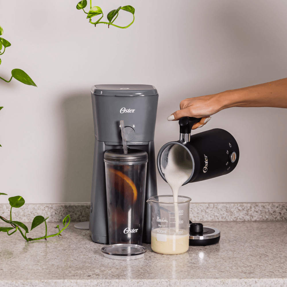 Esse kit contém os seguintes itens: Cafeteira para Café Gelado Oster Iced Coffee 600ml - OCAF820 Com a cafeteira Iced Coffee Oster®, apreciar um delicioso café gelado é uma sensação que você pode ter em qualquer momento e em qualquer lugar. Recrie seus cafés especiais e favoritos em casa, de forma descomplicada e sustentável! - Iced Coffee On The Go: Copo de 600ml com parede dupla, tampa e canudo para você levar o seu café para onde quiser e mantê-lo delicioso por muito mais tempo; - Seu Café Pronto em 4 Minutos: Prepare deliciosas bebidas de café gelado em menos de quatro minutos. - Fácil de Usar: O medidor de água, a colher de café e o indicador de gelo mostram a quantidade ideal de cada ingrediente para você preparar um café perfeito. - Controle de Fluxo: Ajuste o fluxo da sua cafeteira para deixar o seu café mais forte. - Filtro Removível: Conte com um filtro removível lavável e não tenha preocupações em utilizar filtros de papel. - E Mais: Reservatório de água de 350ml e Colher dosadora Dimensões [LxAxP]: 206 x 332 x 155 mm Selo de Segurança OCP SGS Garantia (meses): 12 Espumador de Leite Elétrico Oster 4 em 1 - OMLK100 Prepare cafés e suas variações de maneira prática e simples. Com o Espumador de Leite Oster® você vive uma experiência completa de textura e sabor em cada xícara. Imperdível para os verdadeiros amantes do café. •Viva a experiência completa dos melhores cafés! -Base Aquecedora Independente; -Led Indicador de Função; -300ML de Capacidade; -Tampa Transparante que Evita Vazamentos; - 4 em 1 O Espumador de Leite Oster® oferece 4 funções para criar diferentes tipos de bebida: Apenas espumar: permite espumar e misturar bebidas sem aquecê-las. Aquecer com espuma fina: aquece e mistura sua bebida enquanto cria uma leve espuma. Apenas aquecer: aquece e mistura sua bebida sem espumar. Aquecer com espuma grossa: aquece e mistura sua bebida com uma espuma grossa. - Base Aquecedora Independente: Muito mais praticidade na hora de servir. - Tampa Transparente: Você acompanha o preparo das bebidas sem precisar abrir o recipiente. Isso conserva a temperatura. - Copo Antiaderente: Facilita a limpeza após o preparo. - Tamanho Compacto: Com capacidade perfeita e tamanho compacto, você poderá guardar seu Espumador de Leite facilmente. - Porta-fio e base antiderrapante: Prático para guardar, mais seguro para manusear. - Dica: Leites com maior teor de gordura criam espumas melhores. Confira nossas indicações: Leite animal: leite de vaca integral. Leite vegetal: leite de amêndoas, castanhas e nozes. E mais: use o leite gelado para obter um resultado mais preciso. • Confira a Sugestão de Proporções: - Cappuccino: 33% de espuma, 33% de espresso e 33% de leite. - Latte: 10% de espuma, 20% de espresso e 70% de leite. - Flat White: 15% de espuma, 45% de espresso e 40% de leite. Espumador de Leite Oster, seu Café nunca foi tão gostoso e tão prático. Dimensões [LxAxP]: 158 x 204 x 100 mm Selo de Segurança OCP SGS Garantia (meses): 12
