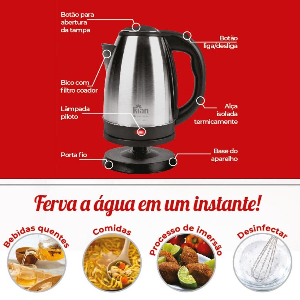 | Kit 2 Chaleiras Elétrica BAK Inox 1.8L 110V Café vermelha | R$ 128,99 | — | 4.7/5 | 1 |