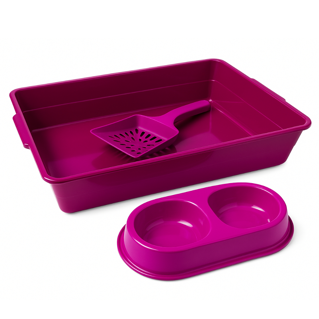 Kit Caixa de Areia para Gatos Bandeja + Comedouro Duplo + Pá Higiênica