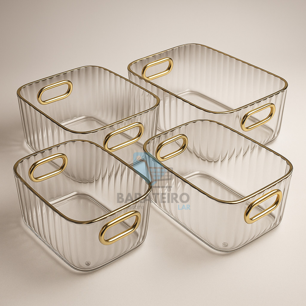 Kit Caixa Decorativa Transparente Multiuso Alça Dourada